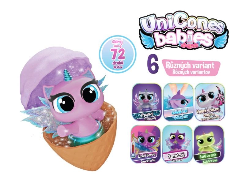 Ieškai mielos staigmenos? UNICONES vienaragio kūdikiai atkeliauja stilingame kornete ir laukia, kol juos atrasi. Kiekviena figurėlė turi dideles akis, magiškus sparnus ir unikalių detalių – nuo blizgučių iki švytinčių efektų tamsoje. Dėl plačios personažų įvairovės kiekvienas išpakavimas tampa tikru nuotykiu.
