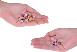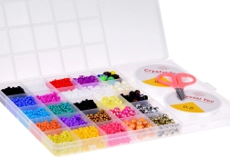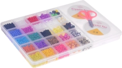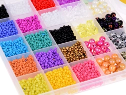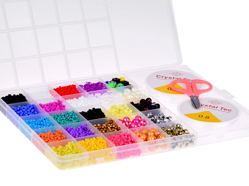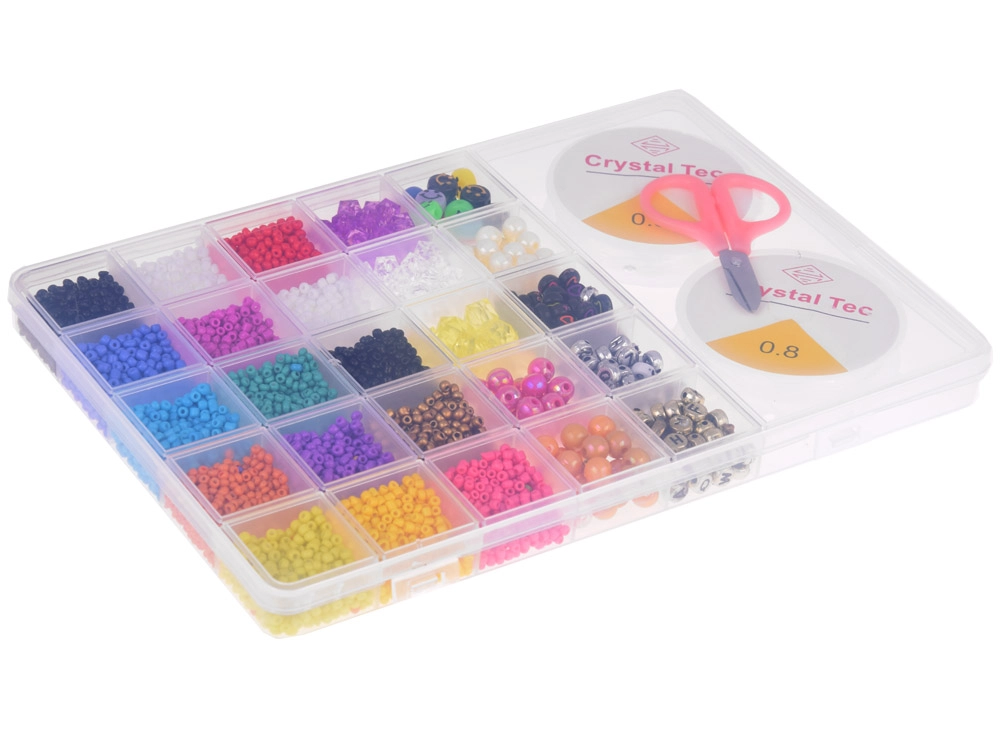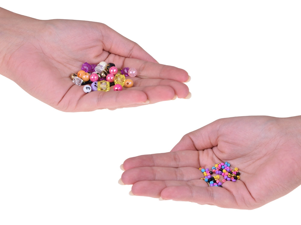 Šis gausiai sukomplektuotas rinkinys idealiai tinka apyrankėms, vėriniams, pakabukams ir kitiems aksesuarams kurti. Dėl plačios mėlynos, turkio, violetinės, rožinės, žalios ir baltos atspalvių paletės bei įvairių karoliukų formų sukursite originalius aksesuarus bet kokiai progai. Organizatorius su skyreliais palaiko tvarką – karoliukai nesusimaišo, o darbas vyksta greitai ir patogiai.