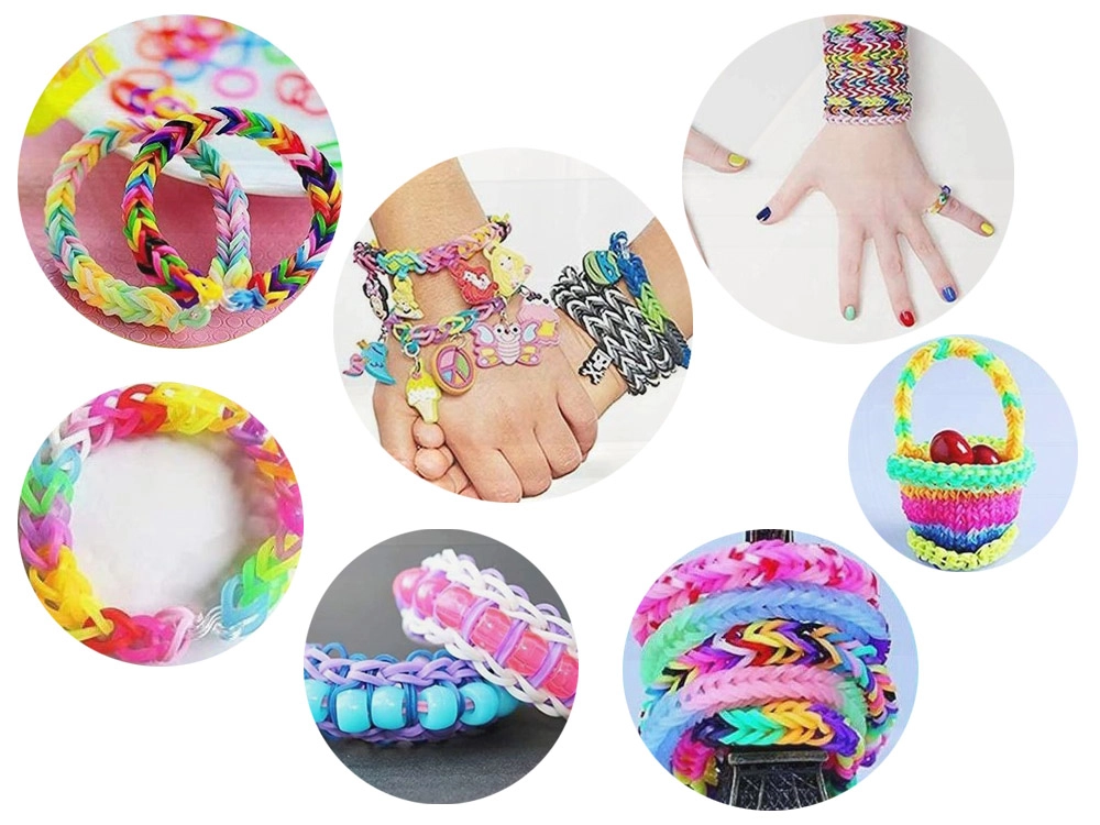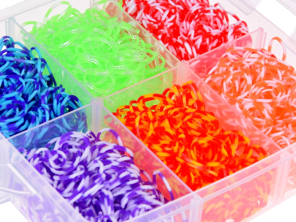 - apie 4500 vnt. gumyčių, skaidrūs jungiamieji kabliukai, spalvoti/pasteliniai karoliukai, 6× maži vąšeliai, 1× didelis vąšelis, 2× stovelis, 2× audimo rėmelis, 6× silikoninis pakabukas, skaidrus organizatorius su pertvaromis