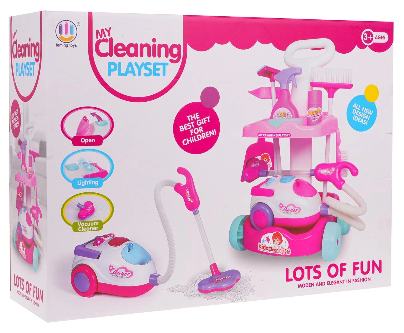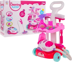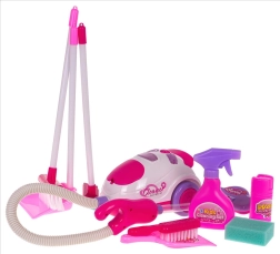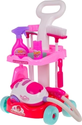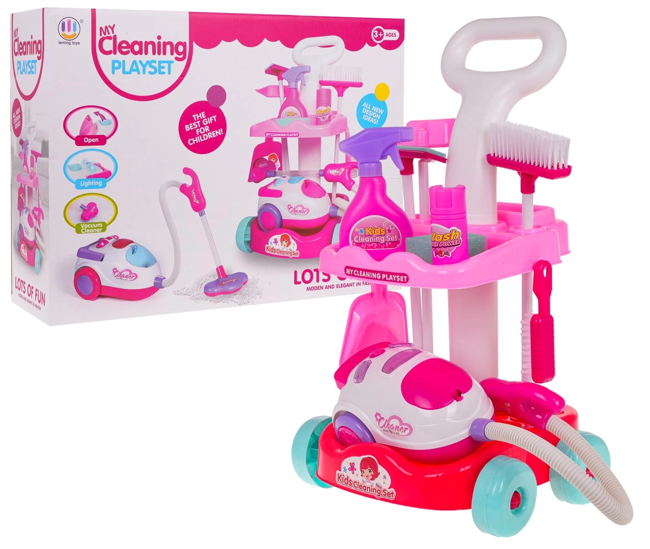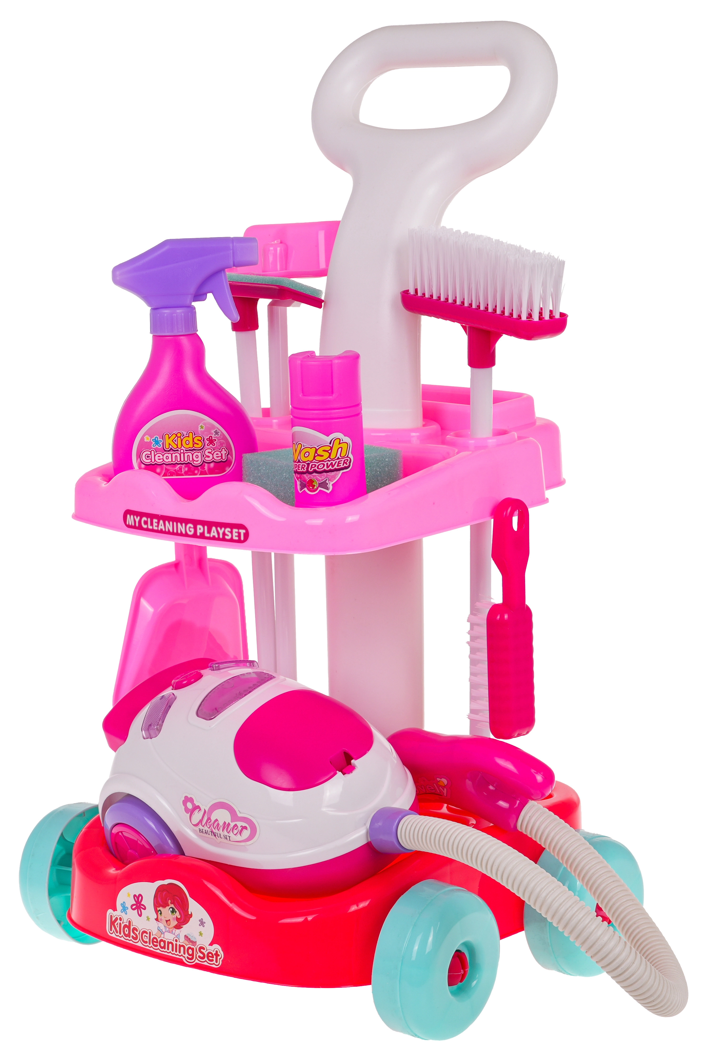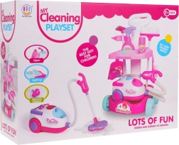 Šis vaikiškas valymo rinkinys siūlo viską, ko reikia mažiesiems šeimininkams: stabilų ratukais riedantį vežimėlį su dviem lentynomis, interaktyvų dulkių siurblį su šviesos ir garso efektais bei platų priedų asortimentą. Dėl saugaus, patvaraus plastiko ir patrauklių spalvų vaikai pamėgs tikro tvarkymosi mėgdžiojimą ir kartu mokysis palaikyti švarą.