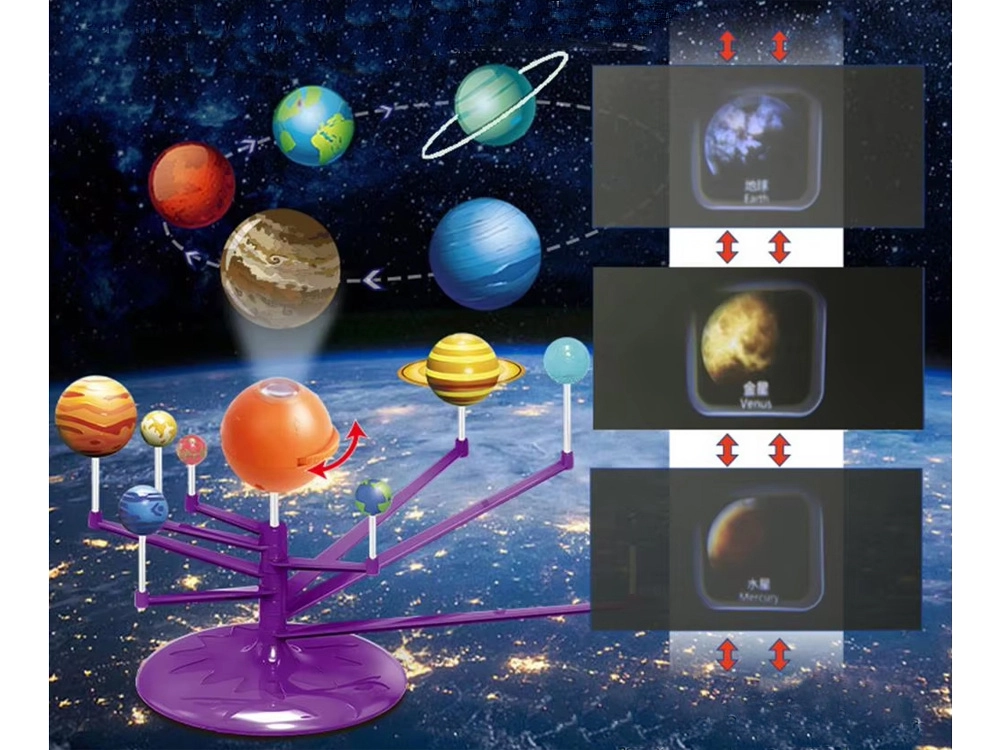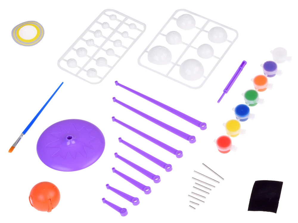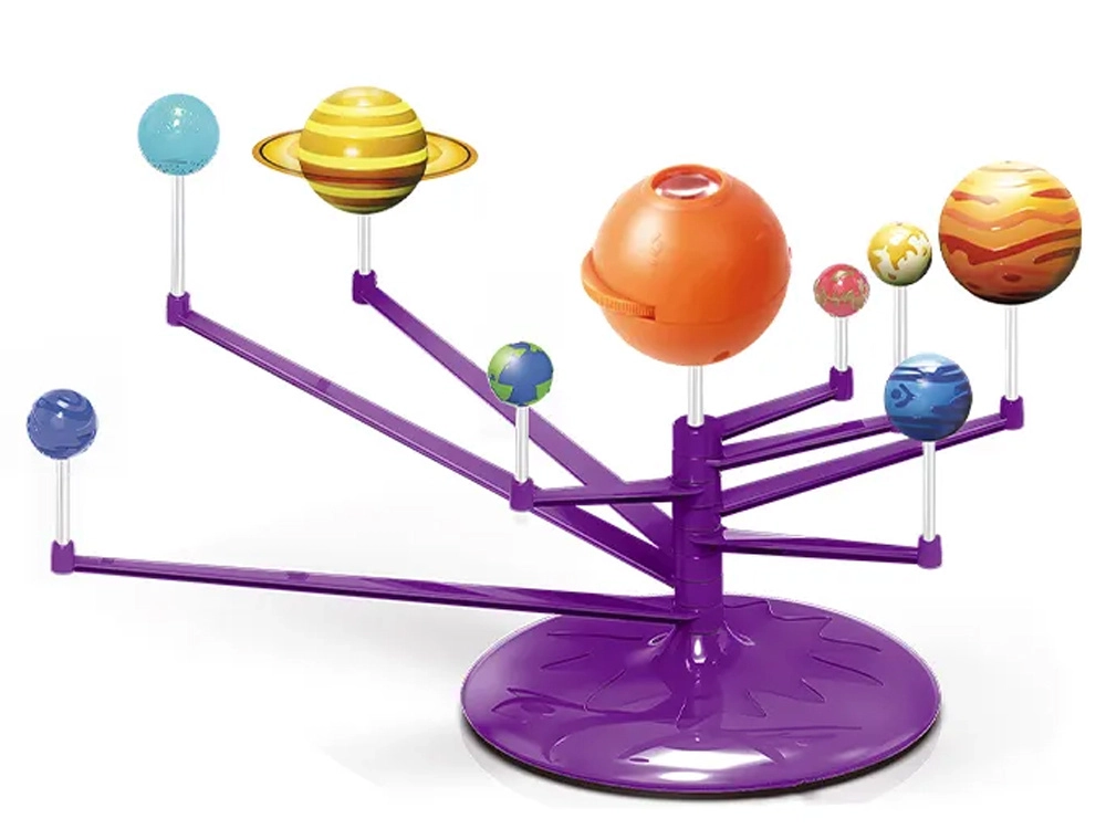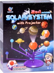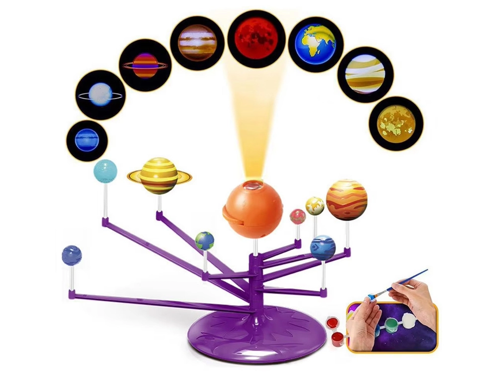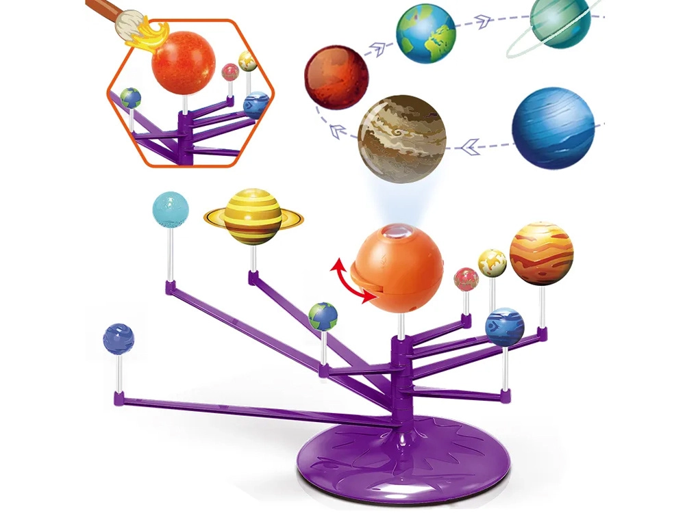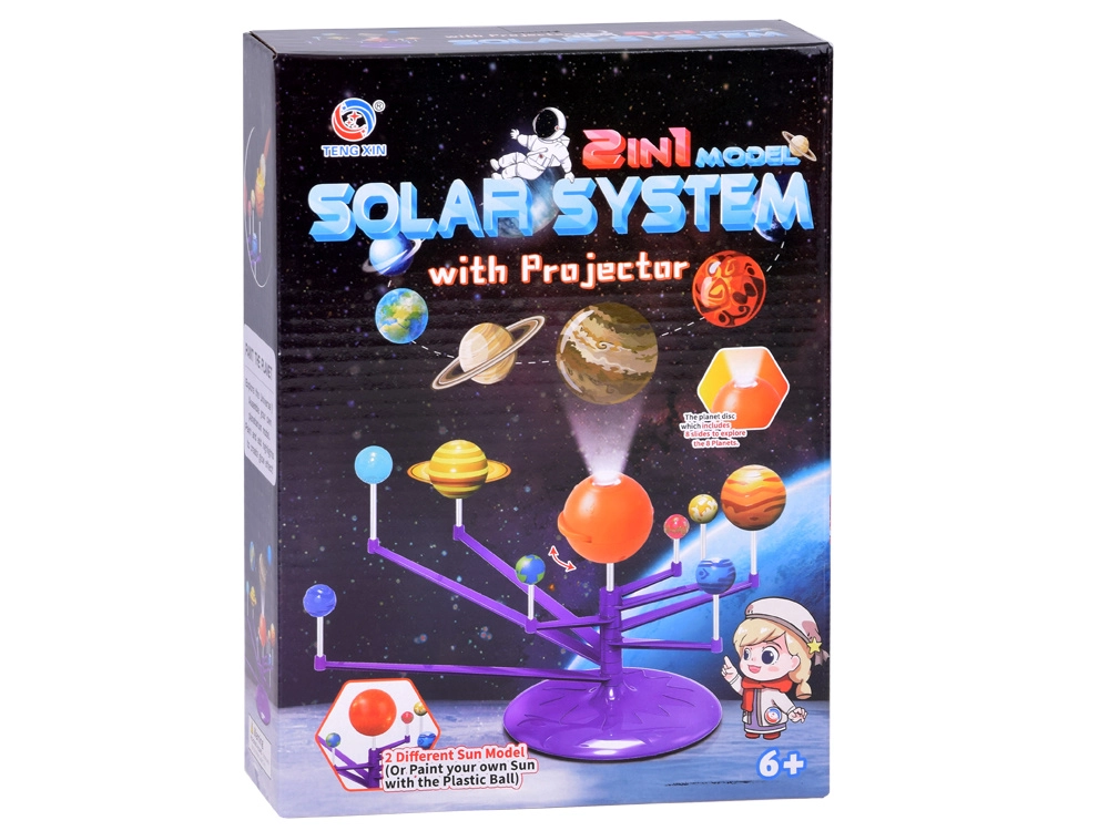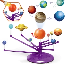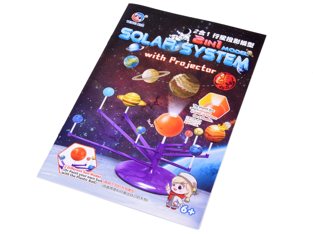 Mini Saulės sistemos modelis 2‑in‑1 – interaktyvus, kūrybiškas ir edukacinis žaislas, leidžiantis vaikams surinkti ir patiems nuspalvinti planetas. Rinkinyje yra oranžinis kamuolys – Saulė su projektoriumi, kuris projektuoja planetas ant lubų.