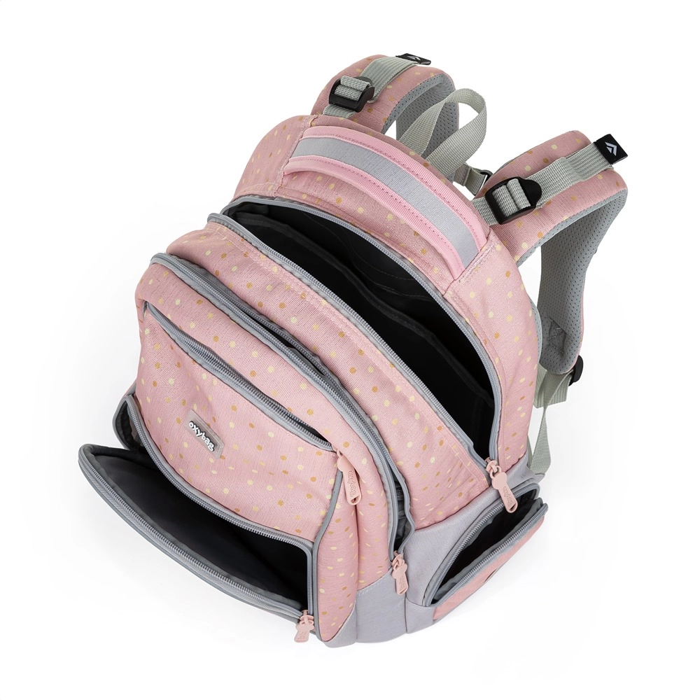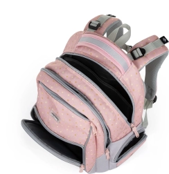 Praktiškas išdėstymas: dvi vidinės kišenės vadovėliams ir sąsiuviniams, daug mažesnių kišenių smulkmenoms, dvi šoninės kišenės (viena su užtrauktuku, viena atvira) ir papildomi kabliukai ilgesniems diržams tvirtinti. Atšvaitiniai elementai didina vaiko matomumą einant į mokyklą ir namo.