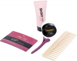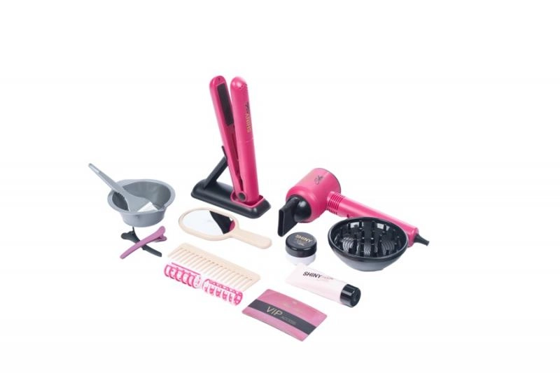 - Baterijomis maitinamas džiovintuvas, plaukų tiesintuvas, šukos, veidrodėlis, bigudžiai, segtukai/klipsai, dubenėlis ir teptukas dažams, priežiūros priedai