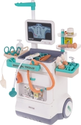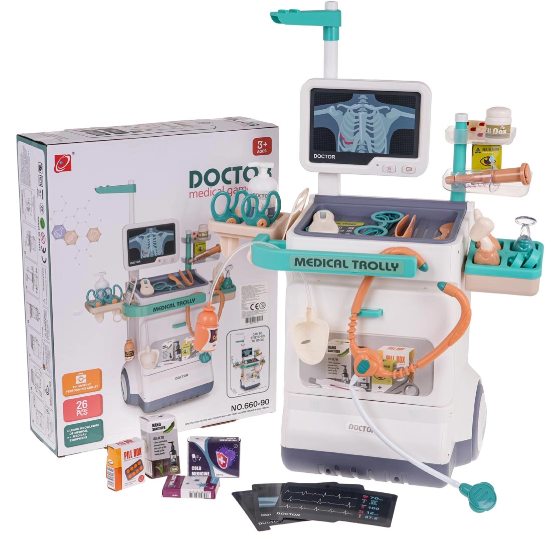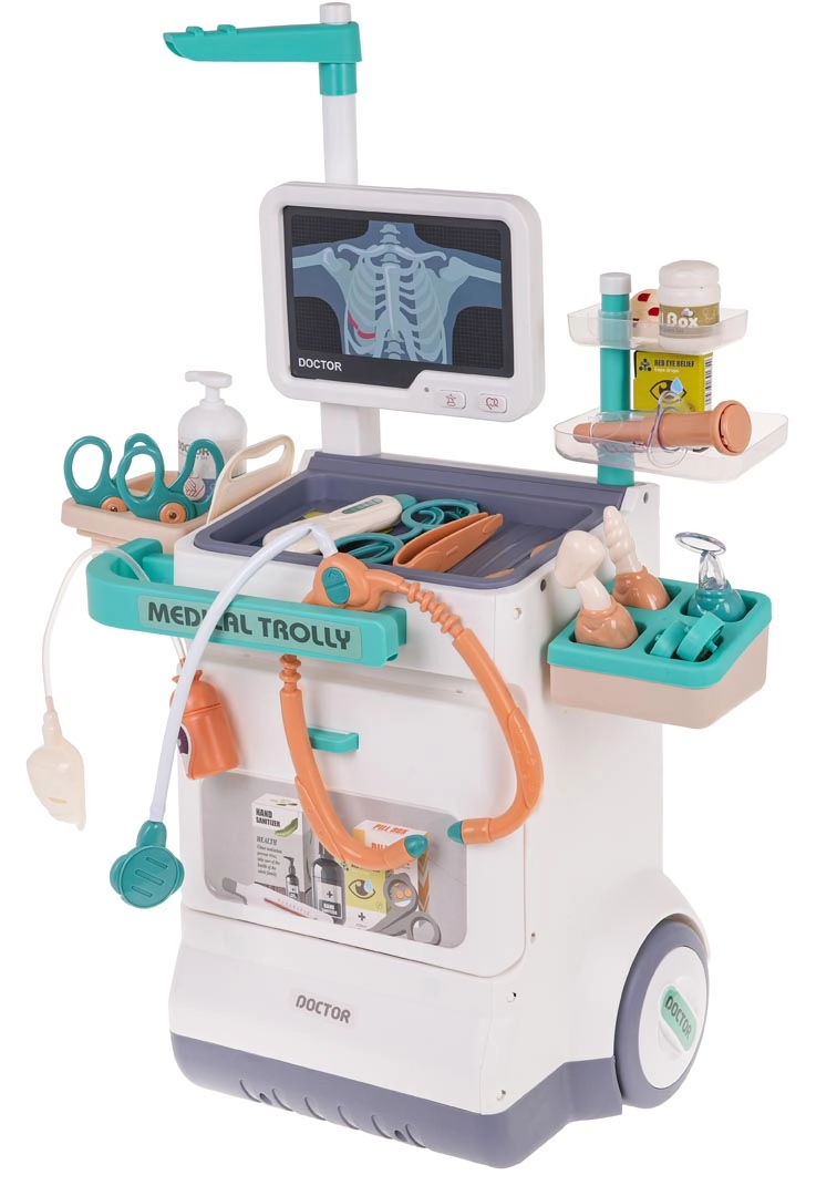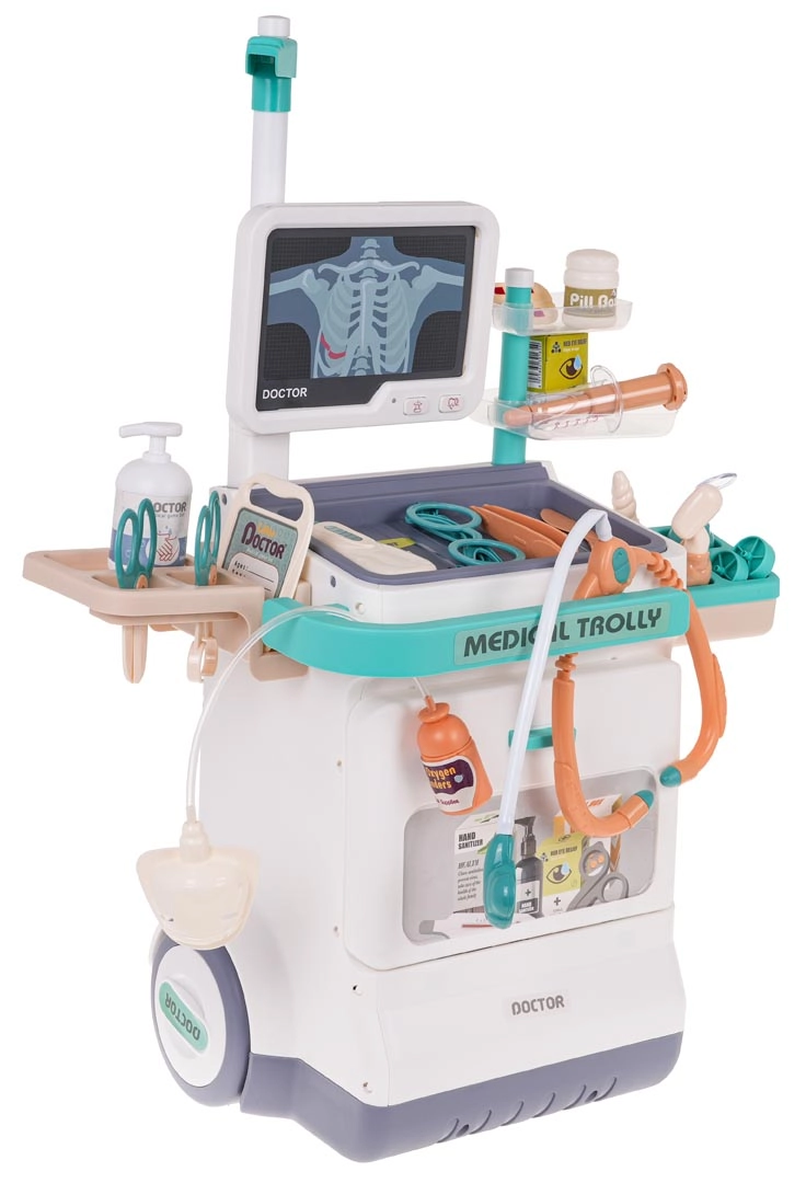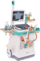 Šis žavingas medicininis vežimėlis yra lengvas ir paprastai valdomas dėl didelių ratukų ir patogios rankenos. Jūsų vaikas gali tapti gydytoju, oftalmologu, kardiologu ar odontologu. Rinkinyje yra pultas su monitoriumi, kuris imituoja širdies plakimo ir aliarmo garsus, o EKG ir RTG vaizdus galima keisti. Tinka vaikams nuo 3 metų.