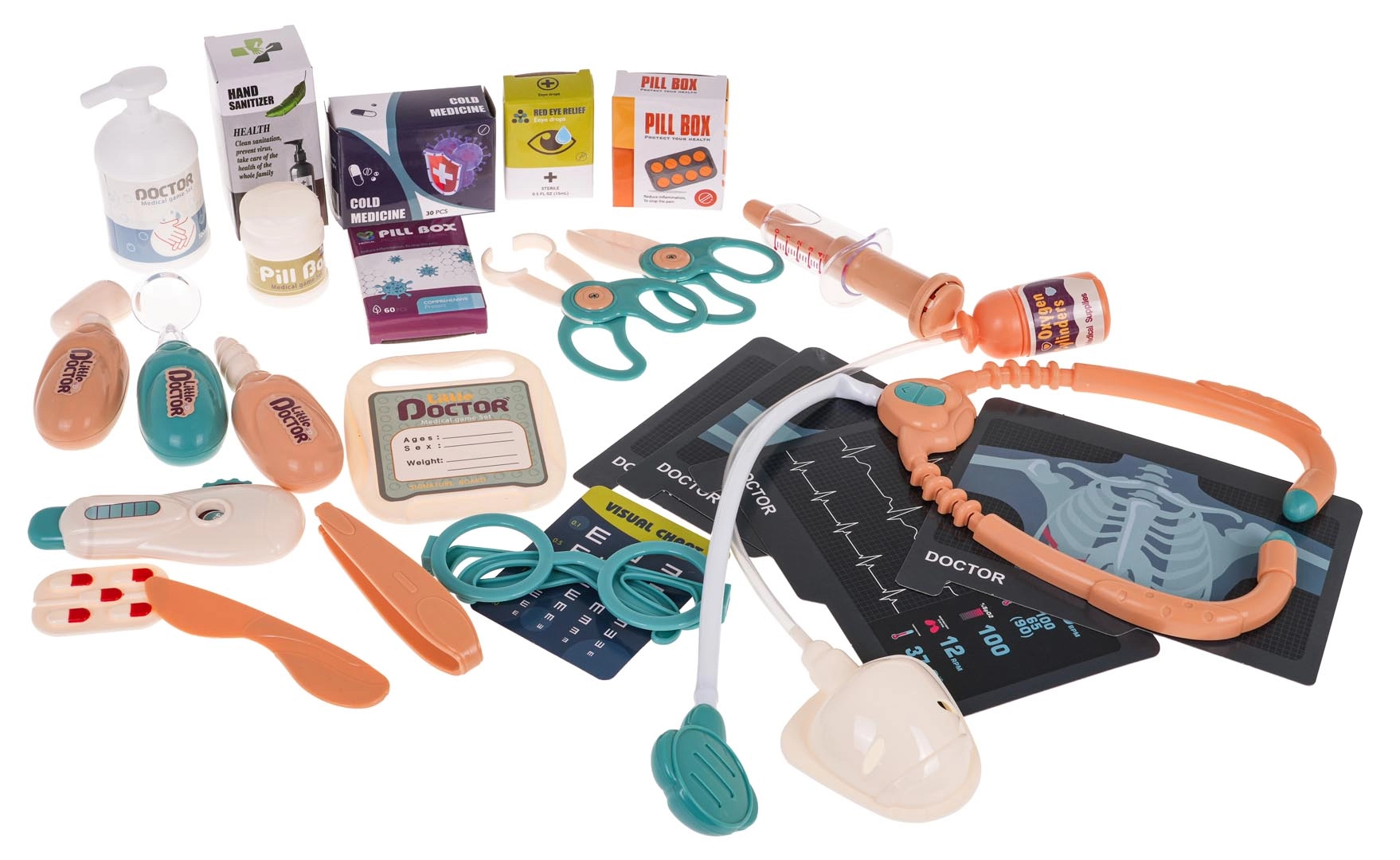 Interaktyvus medicininis rinkinys vaikams nuo 3 metų suteikia pramogą su šviesos ir garso efektais. Jame yra gausybė medicininių įrankių ir galimybė keisti rentgeno (RTG) ir EKG vaizdus, kas skatina vaizduotę ir moko vaikus medicinos pagrindų.