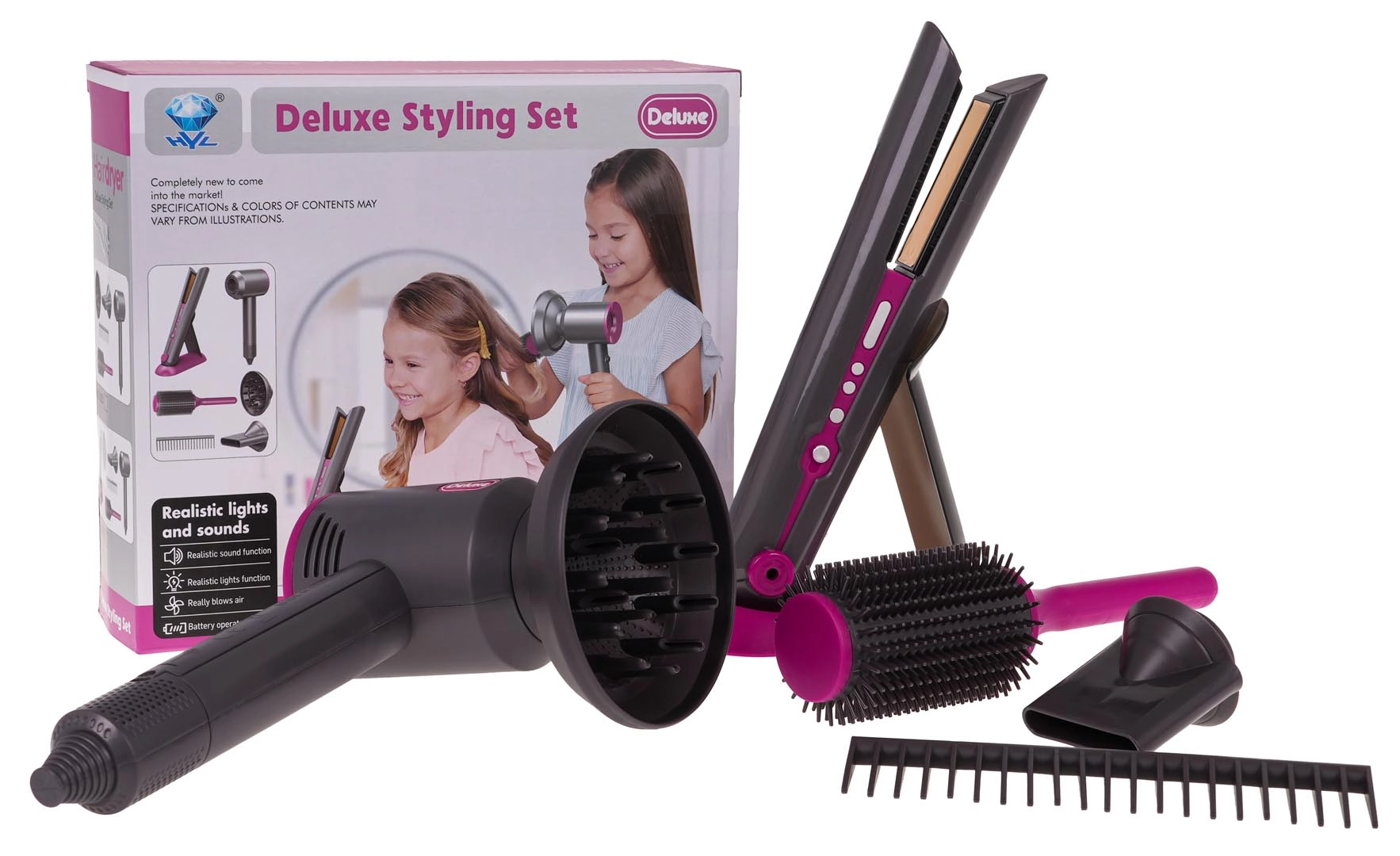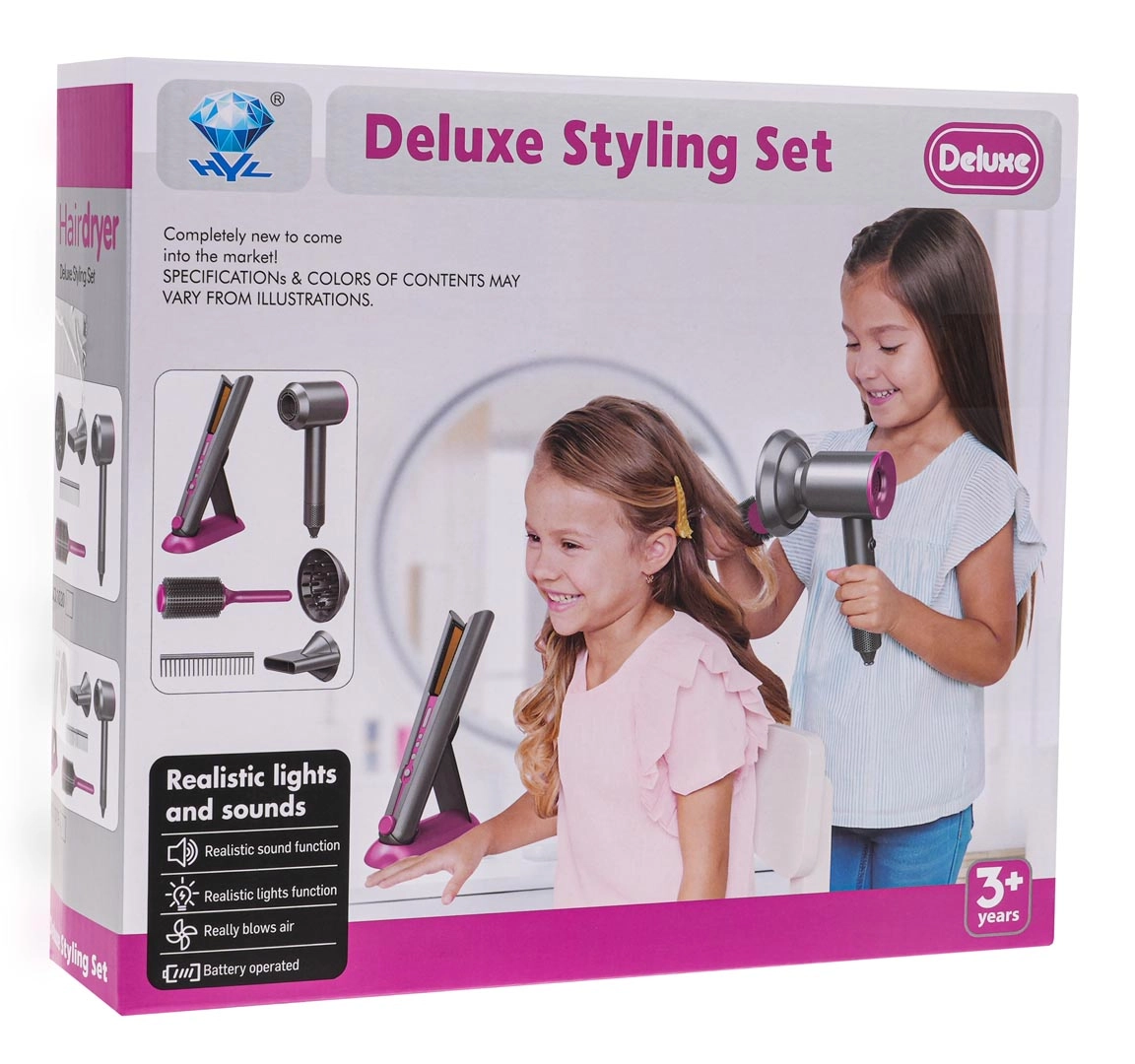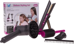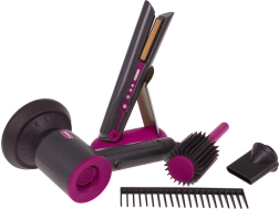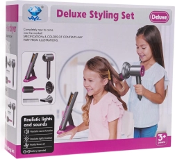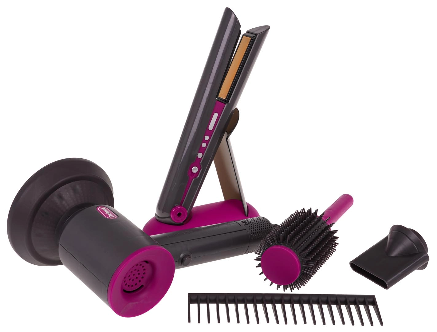 Idealiai tinka vaikams, norintiems tapti mažaisiais kirpėjais. Gausiai sukomplektuotas rinkinys apima feną su keičiamais antgaliais, plaukų žnyples, šuką ir šepetį. Fenas maitinamas dviem AA tipo baterijomis (nepridedamos) ir skleidžia tikro džiovinimo garsus. Įjungtos žnyplės šviečia ir skleidžia būdingus garsus.