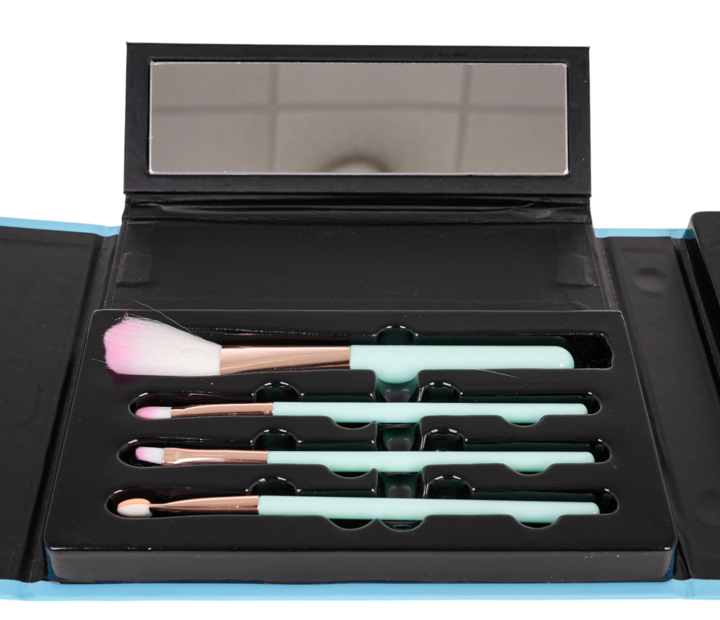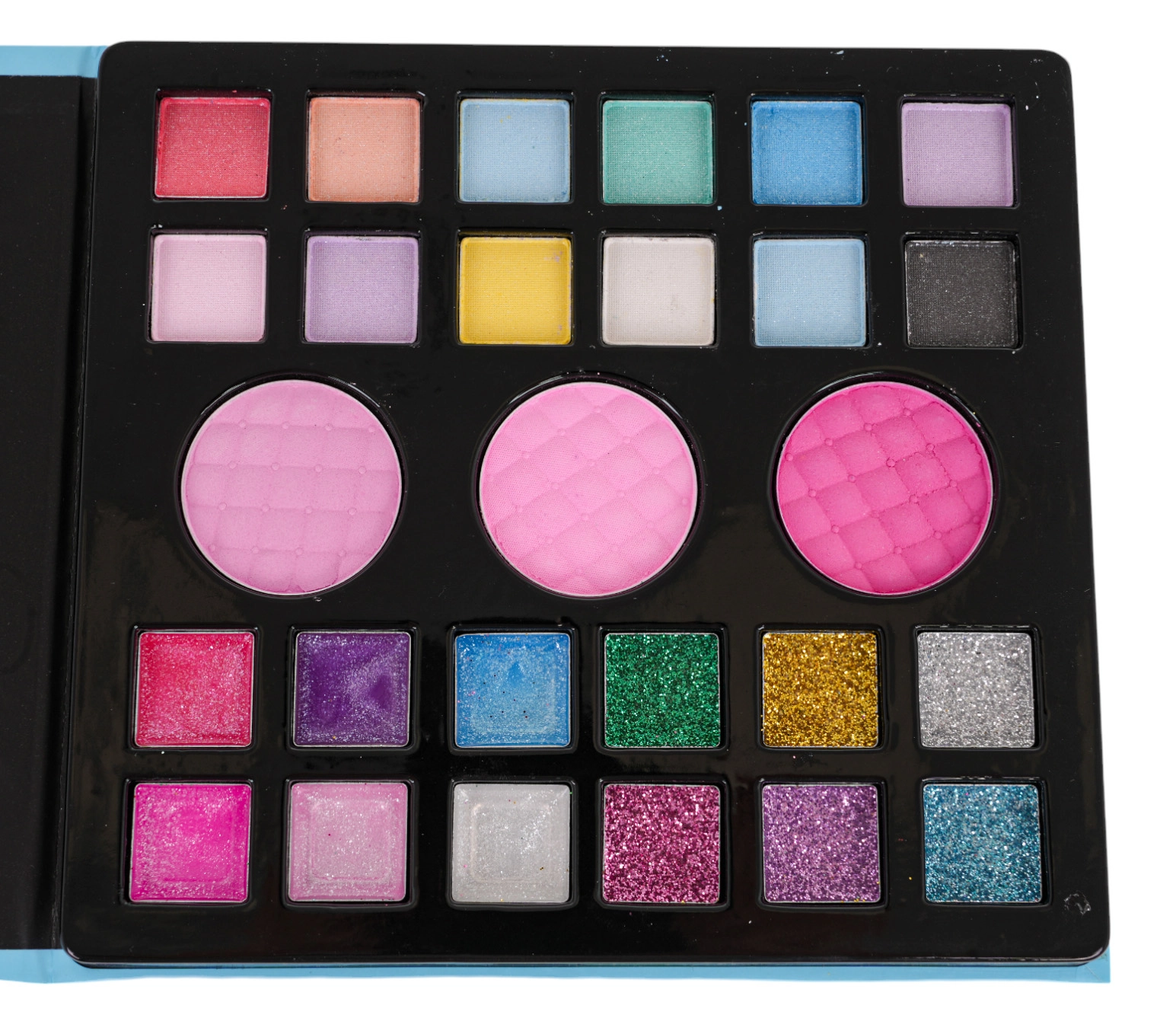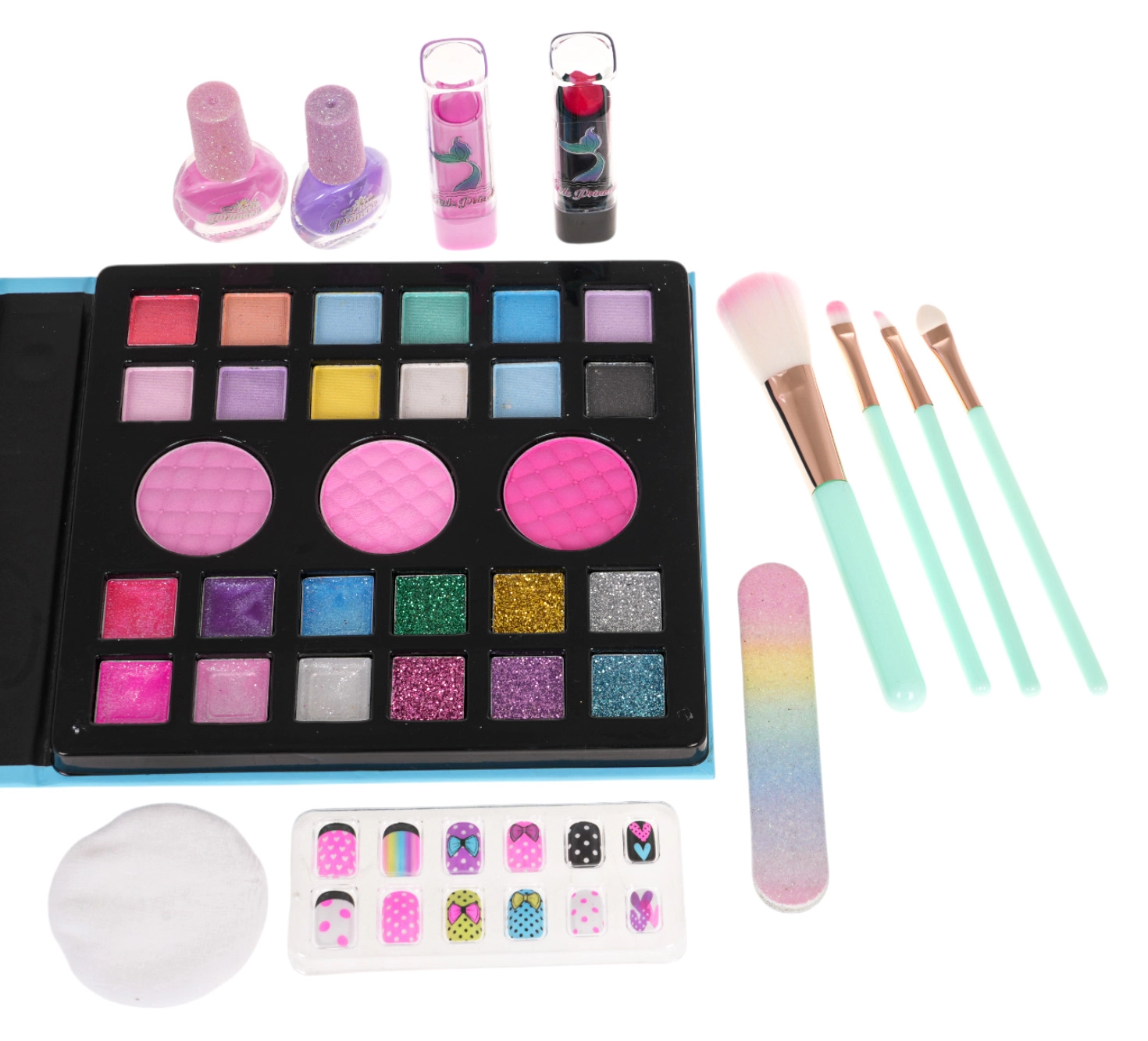 - Išskleidžiama dėžutė; paletė (15 šešėlių, 12 balzamų/lūpų dažų); 2× nagų lakas; dildė; 12× tipai; 2× lūpų dažai; 4× teptukas; makiažo valymo tamponėlis; kosmetinis veidrodėlis