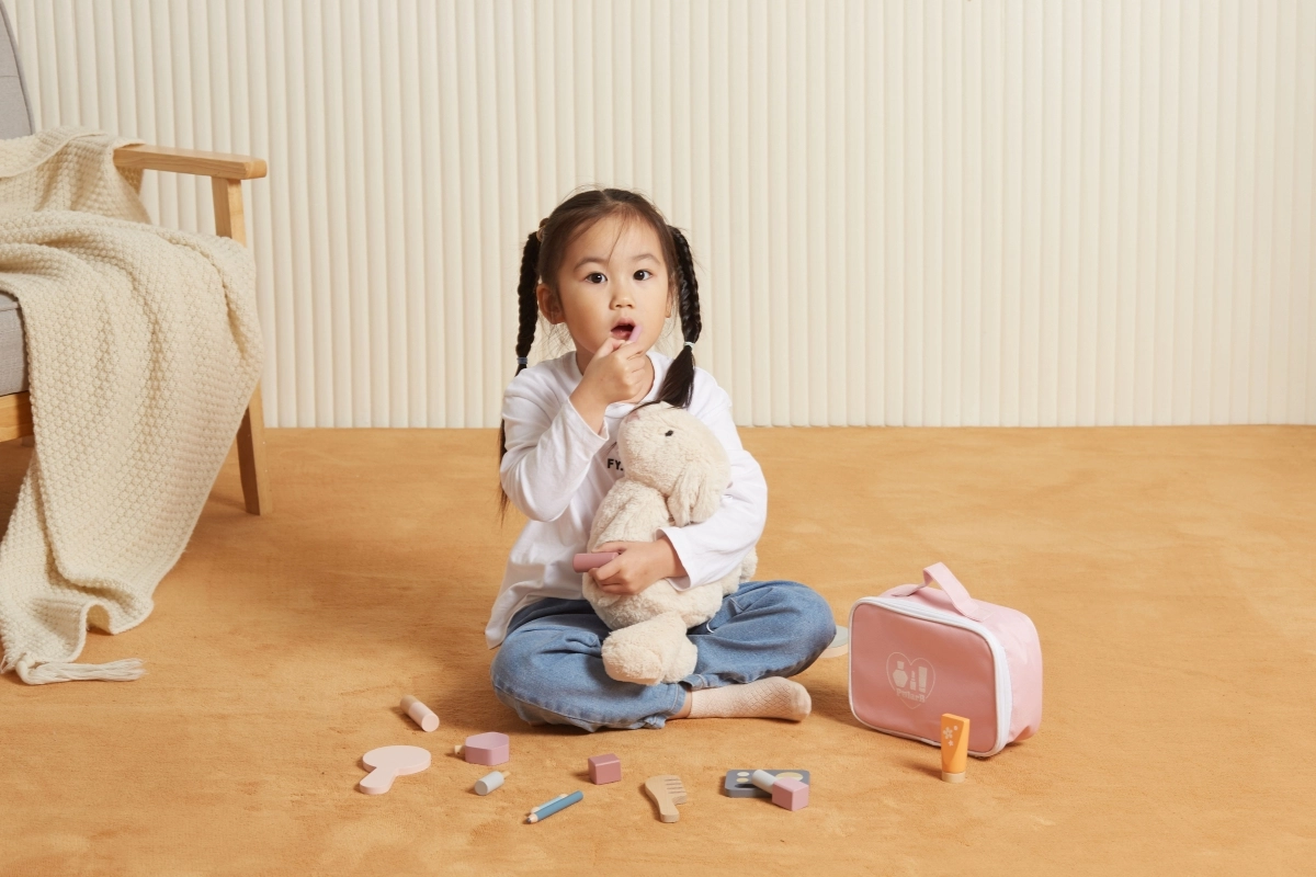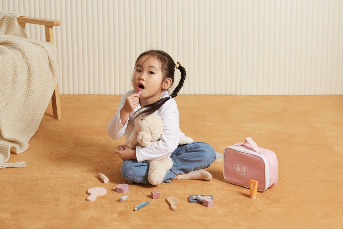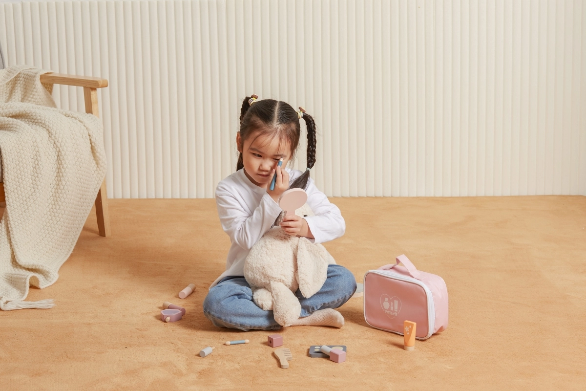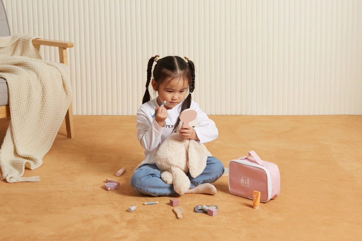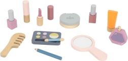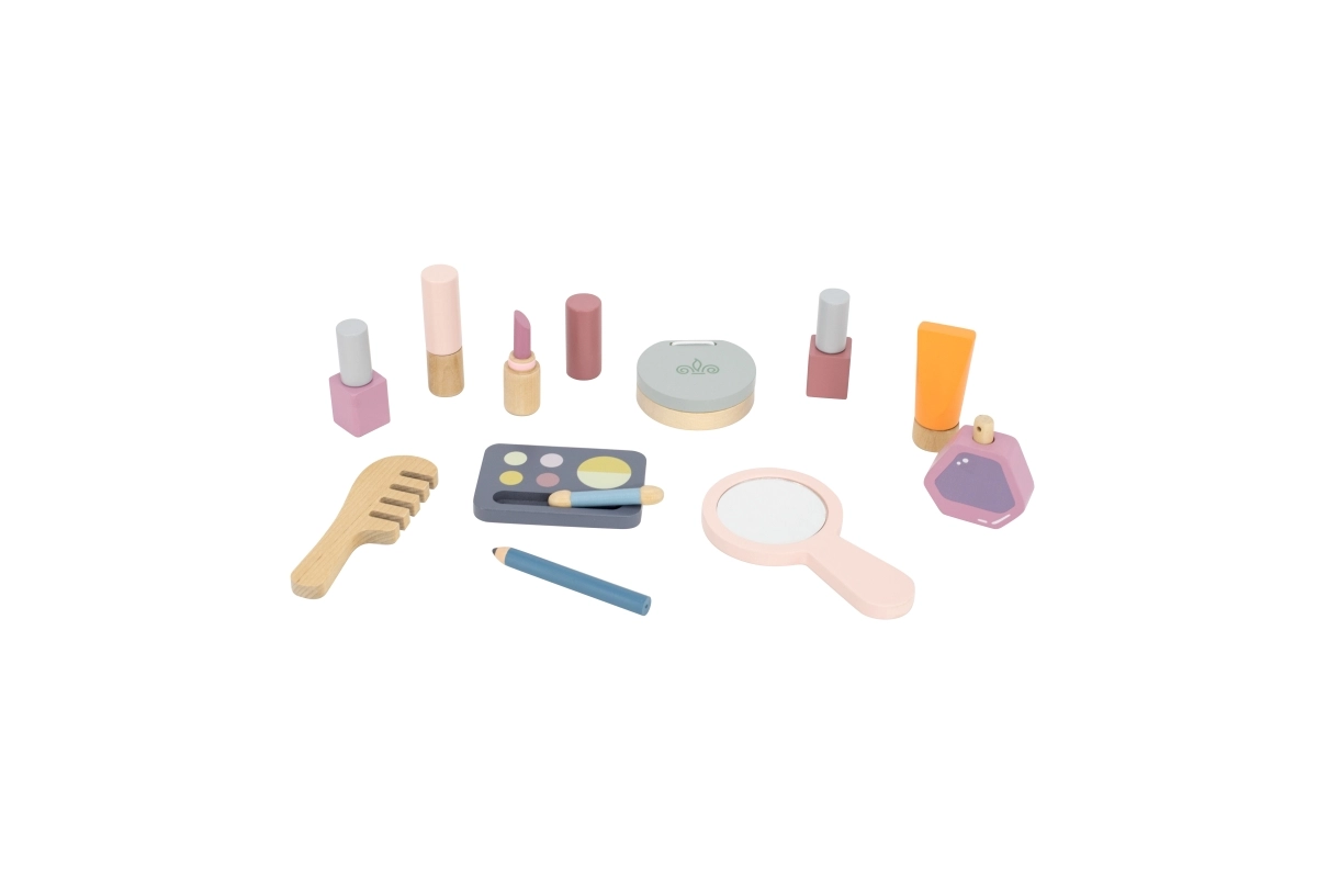 Veidrodėlis, šešėlių paletė, lakai, lūpų dažai, kvepalai ir šukos yra iš medžio ir veikia kaip kosmetikos imitacija – idealiai tinka saugiam ir fantaziją skatinančiam „makiažui“.