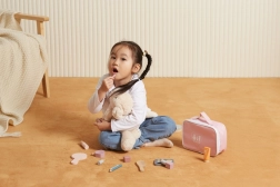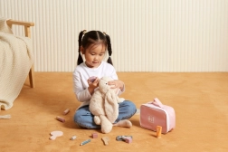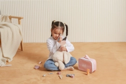 Padovanokite mažajai vizažistei jos pačios grožio kampelį. Stilingas tekstilinis dėklas laiko visus medinius „kosmetikos“ priedus kartu ir leidžia pasiimti juos bet kur. Žaidimas lavina smulkiąją motoriką, vaizduotę ir socialinius įgūdžius vaidmenų žaidimuose.