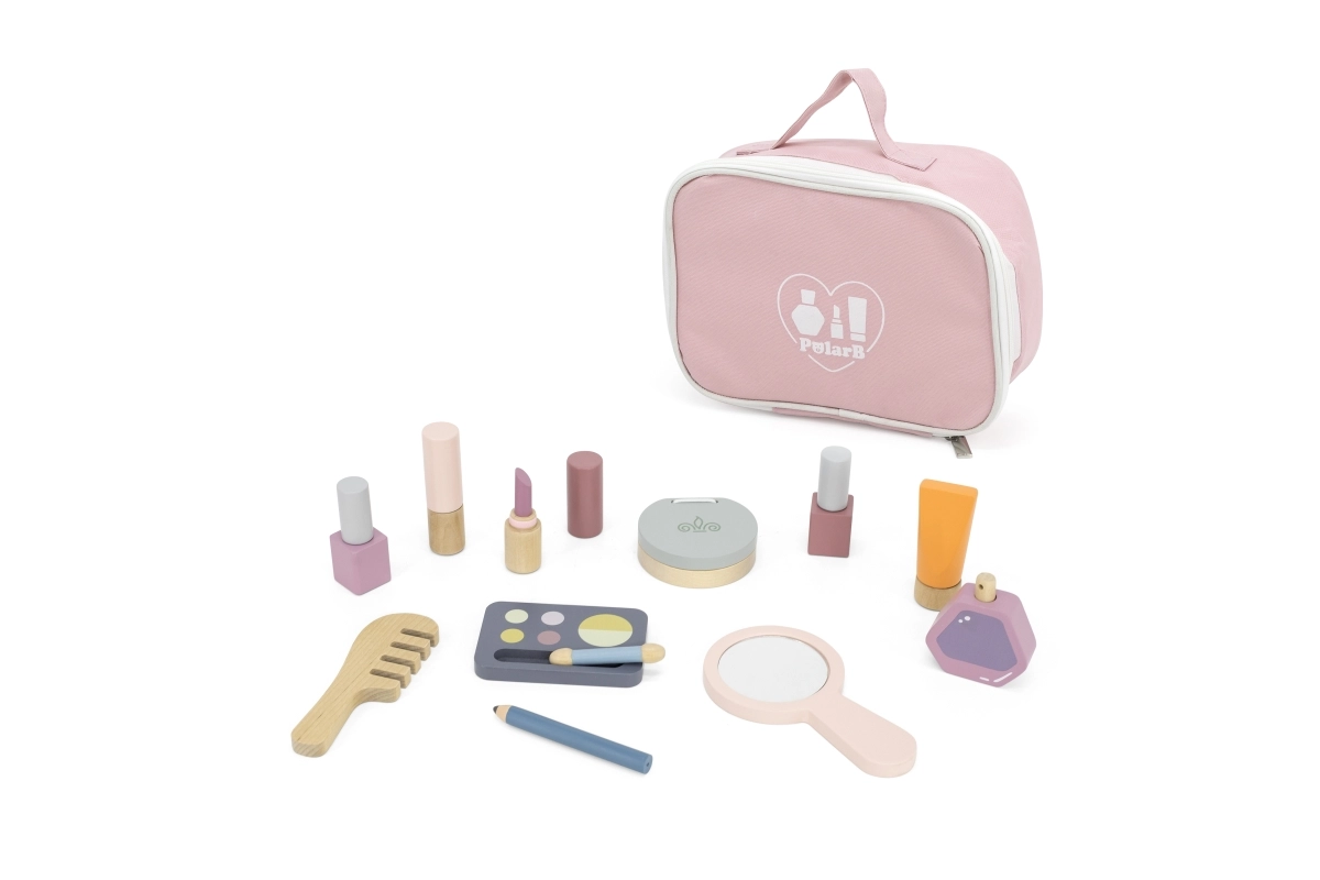 Žavingas medinis Viga PolarB makiažo rinkinys patogiame rožiniame dėkle suteiks vaikams valandų valandas kūrybiško ir išradingo žaidimo. Rinkinyje yra veidrodėlis, šešėlių paletė, pudrinė, 2 nagų lakai, 2 lūpų dažai, kvepalų buteliukas, šukos ir tūbelė – viskas pagaminta iš kokybiškos medienos, glotniai apdirbta ir saugu vaikams.