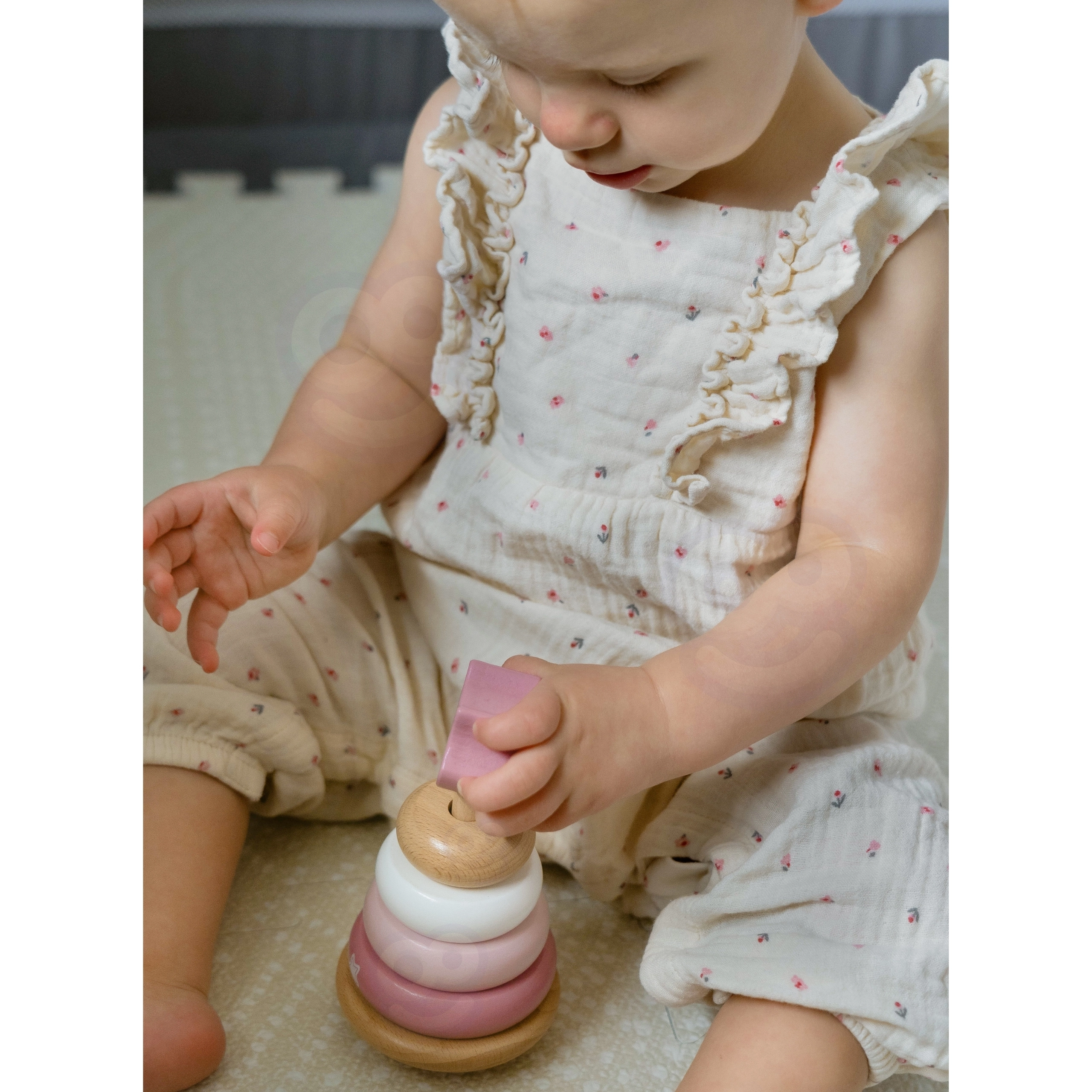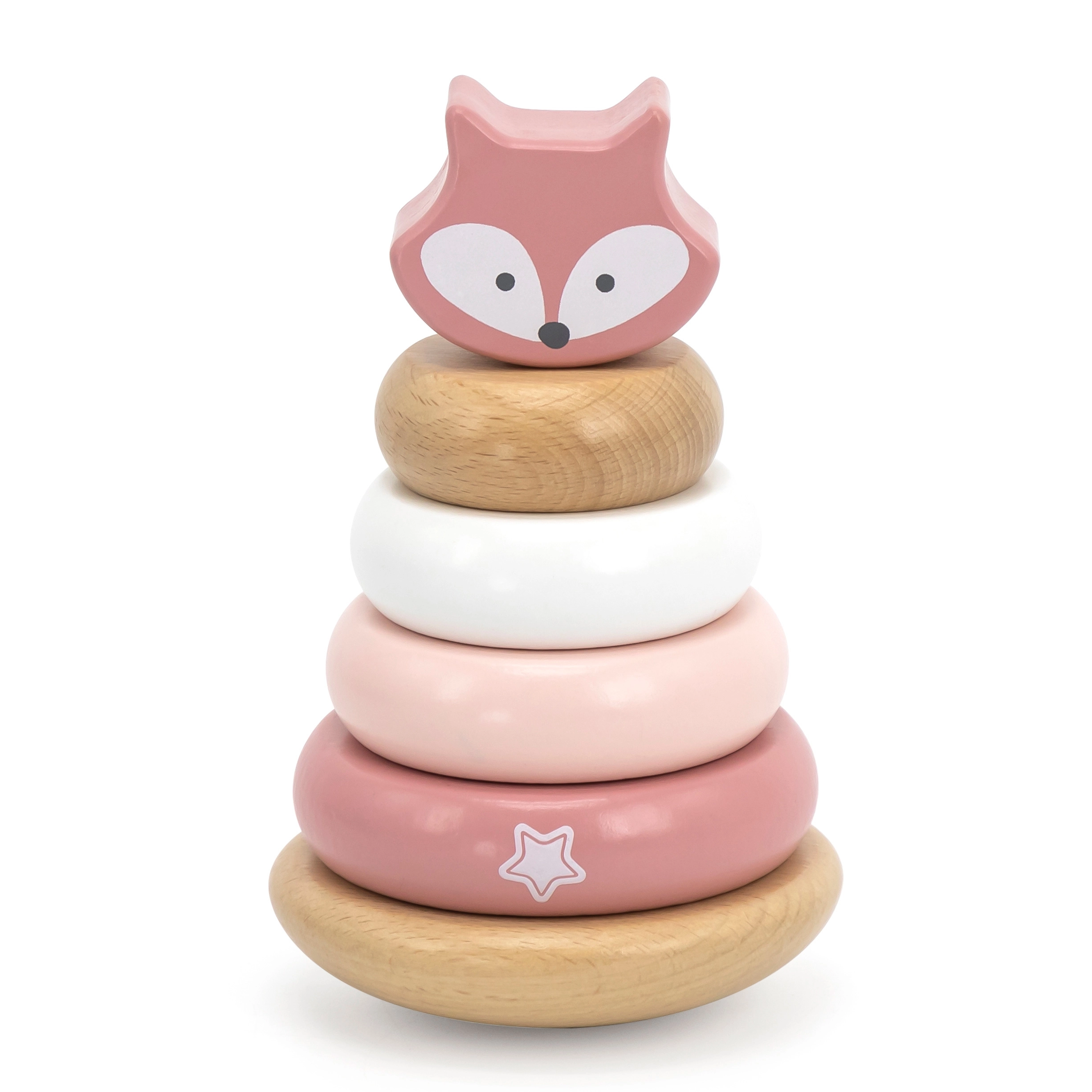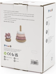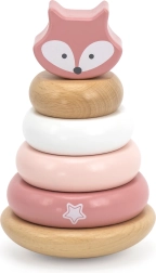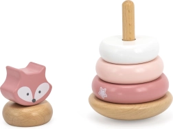 Šis medinis dėliojamas žaislas siūlo 6 dalis švelnių pastelinių spalvų, įskaitant viršutinę detalę su lapiuko galvute. Vaikai mauna žiedus ant centrinio kaiščio pagal dydį, spalvą ar fantaziją – taip lavinamas loginis mąstymas, kantrybė ir erdvinis suvokimas.