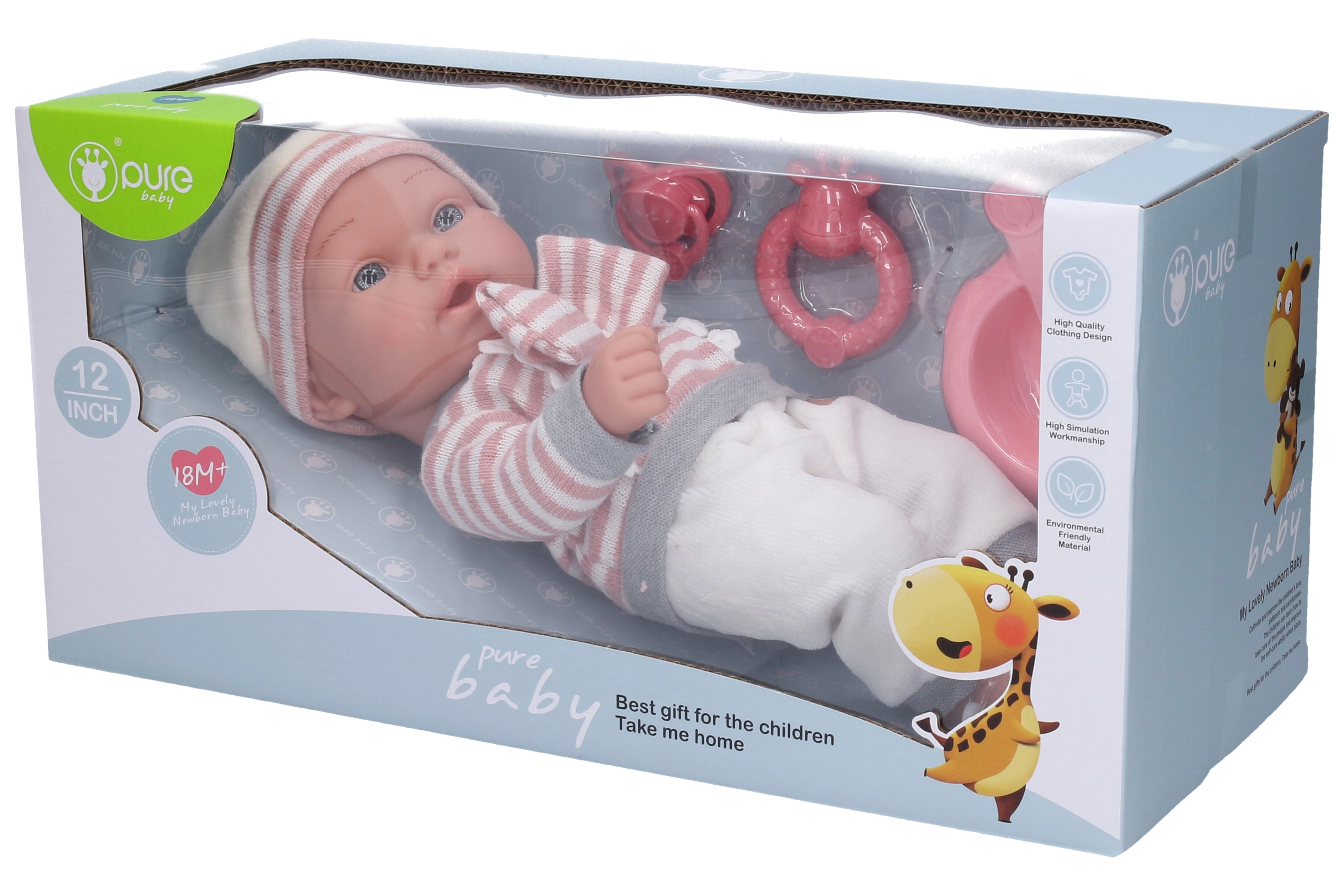 Leiskite savo mažyliui kurti nuosavas istorijas žaidžiant su šia nuostabia lėle. Dėl realistinio 30 cm dydžio ją lengva laikyti net ir mažesniems vaikams. Tokie priedai kaip čiulptukas, barškučiais ir dubuo su stalo įrankiais ne tik praplės žaidimo galimybes, bet ir padės lavinti smulkiąją motoriką.