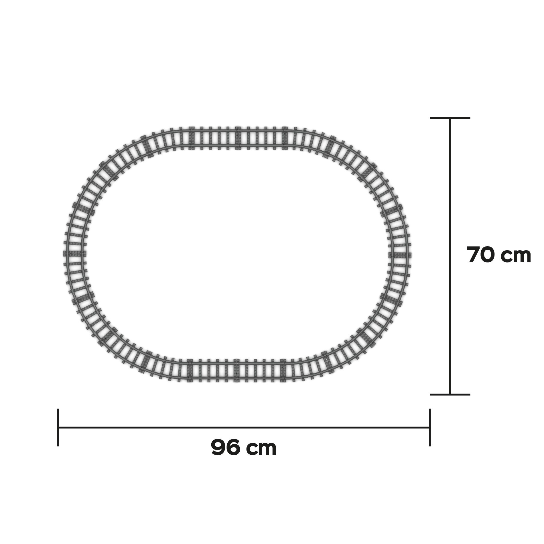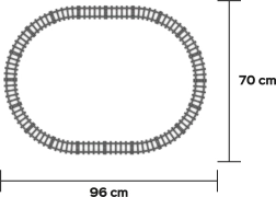 - Bėgių trasa 96 × 70 cm – 16 lenktų + 4 tiesūs bėgiai