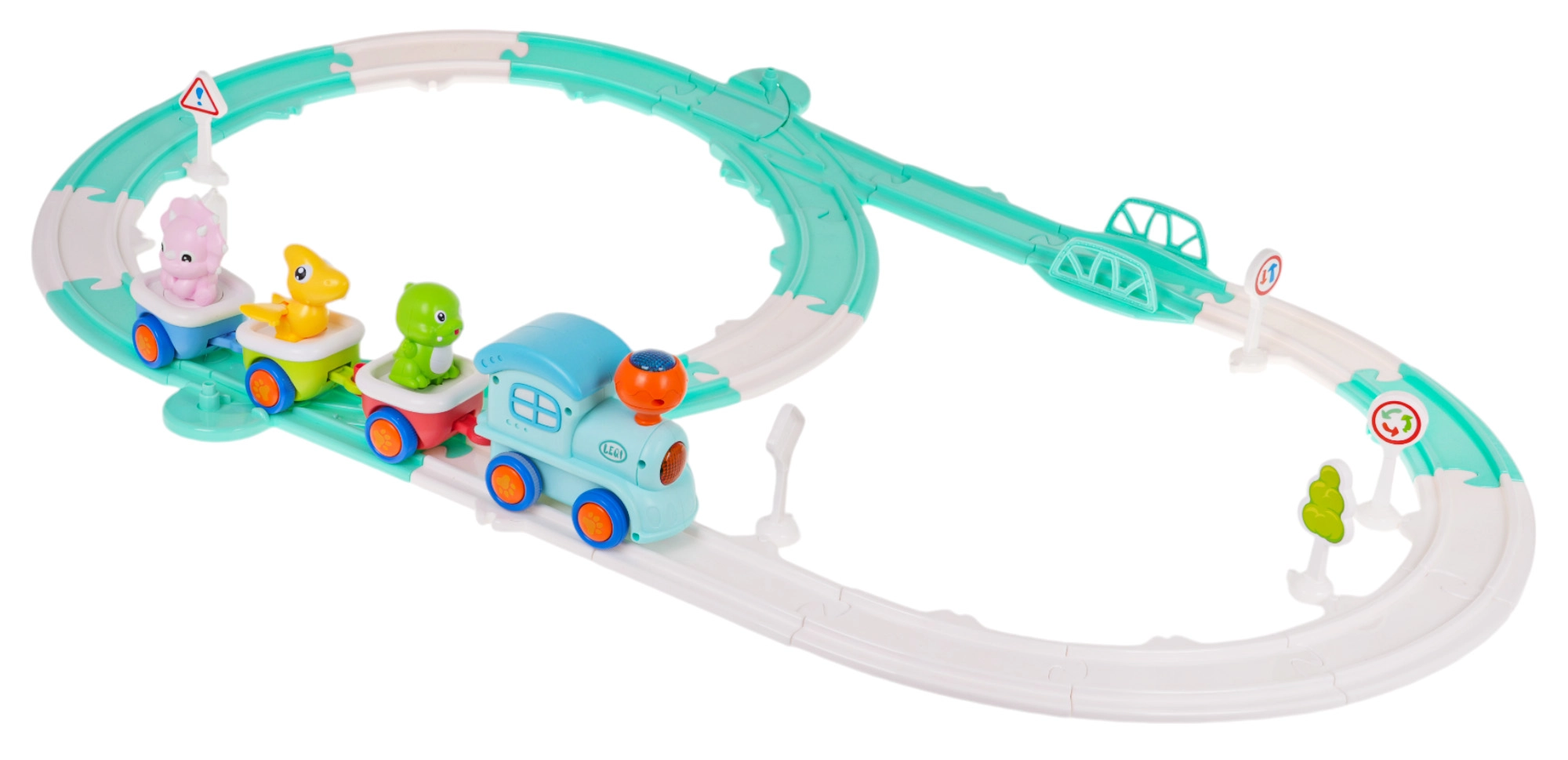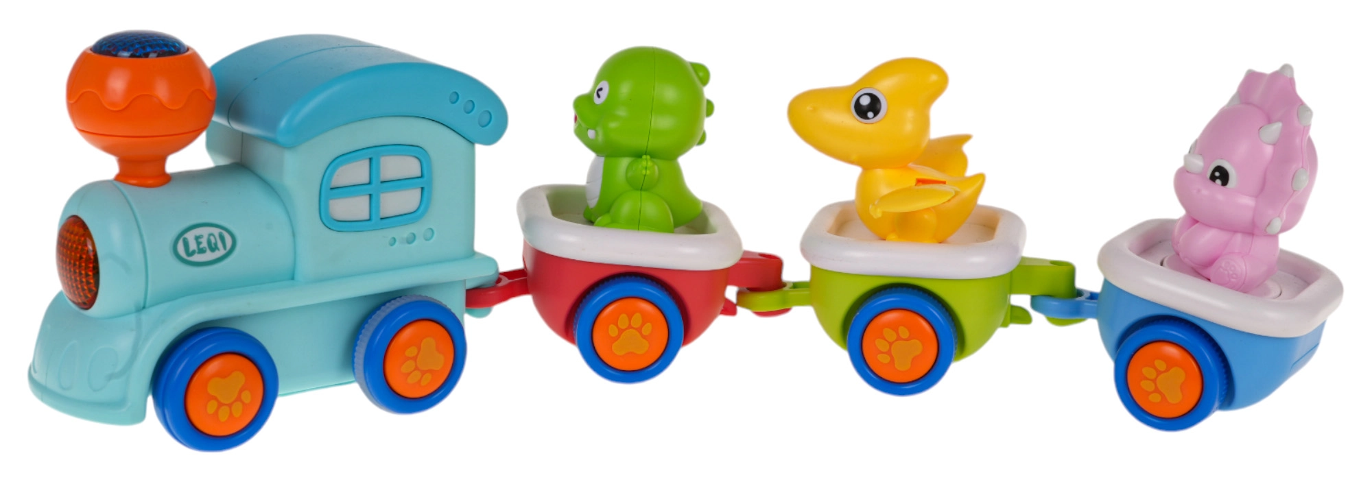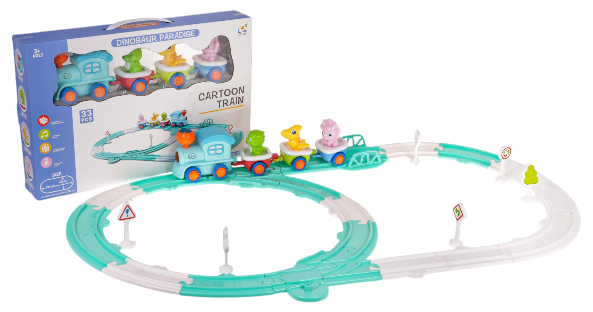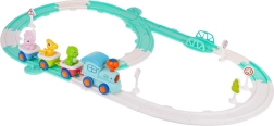 Ši interaktyvi dinozaurų traukinio trasa suteiks daug džiaugsmo vaikų kambariui. Garvežys su 2× AA baterijomis įsijungia šviesas ir melodijas, o sąstatas lekia spalvingais bėgiais. Kiekvieną iš 3 vagonėlių galima lengvai atjungti, o dinozaurų figūrėles – išimti savarankiškam žaidimui.