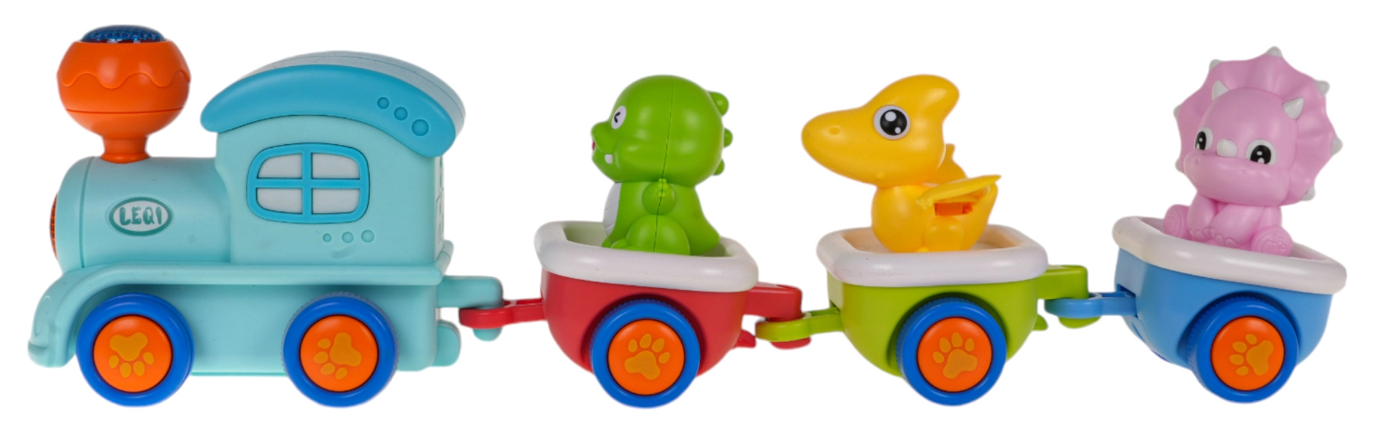 Trys atjungiami vagonėliai su išimamomis dinozaurų figūrėlėmis skatina kurti istorijas ir žaisti savarankiškai.
