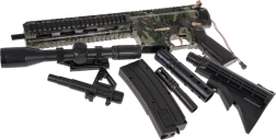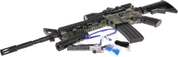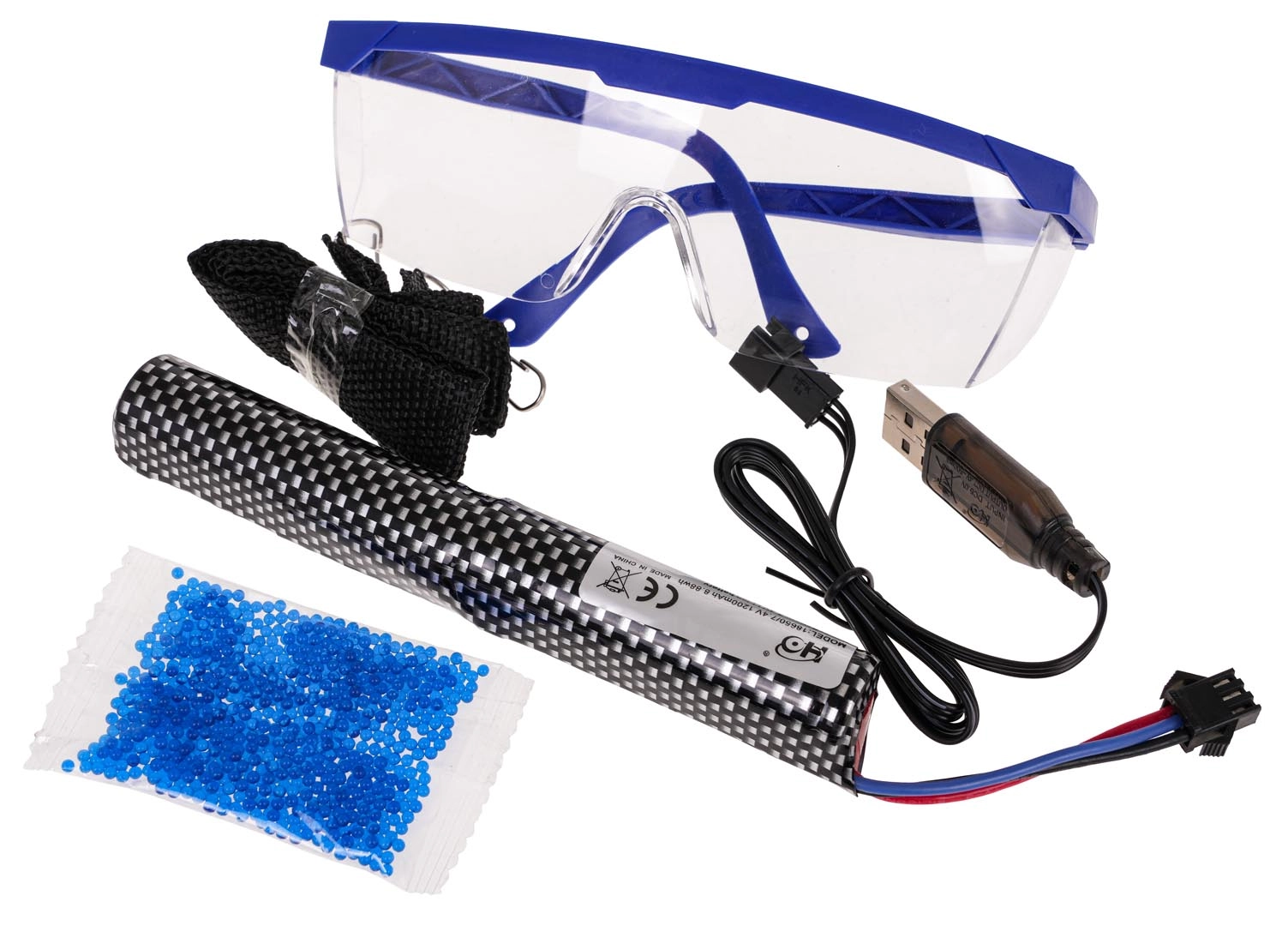 - karabinas, dėtuvė, vamzdis, slopintuvas, taikiklis, buožė, USB laidas, 7,4 V akumuliatorius, maišelis su rutuliukais paruošimui, dirželis, apsauginiai akiniai, instrukcija (EN), dovanų pakuotė