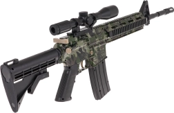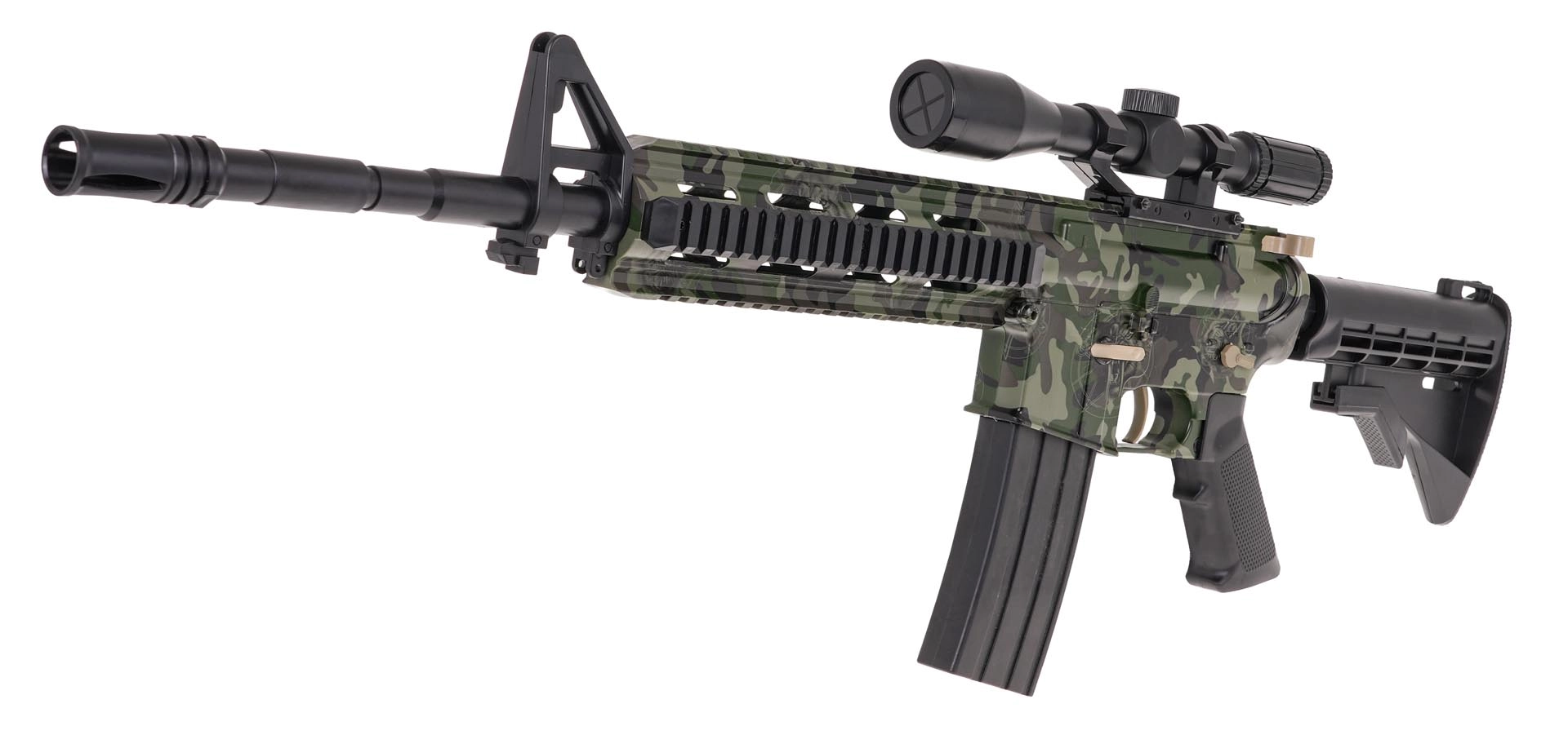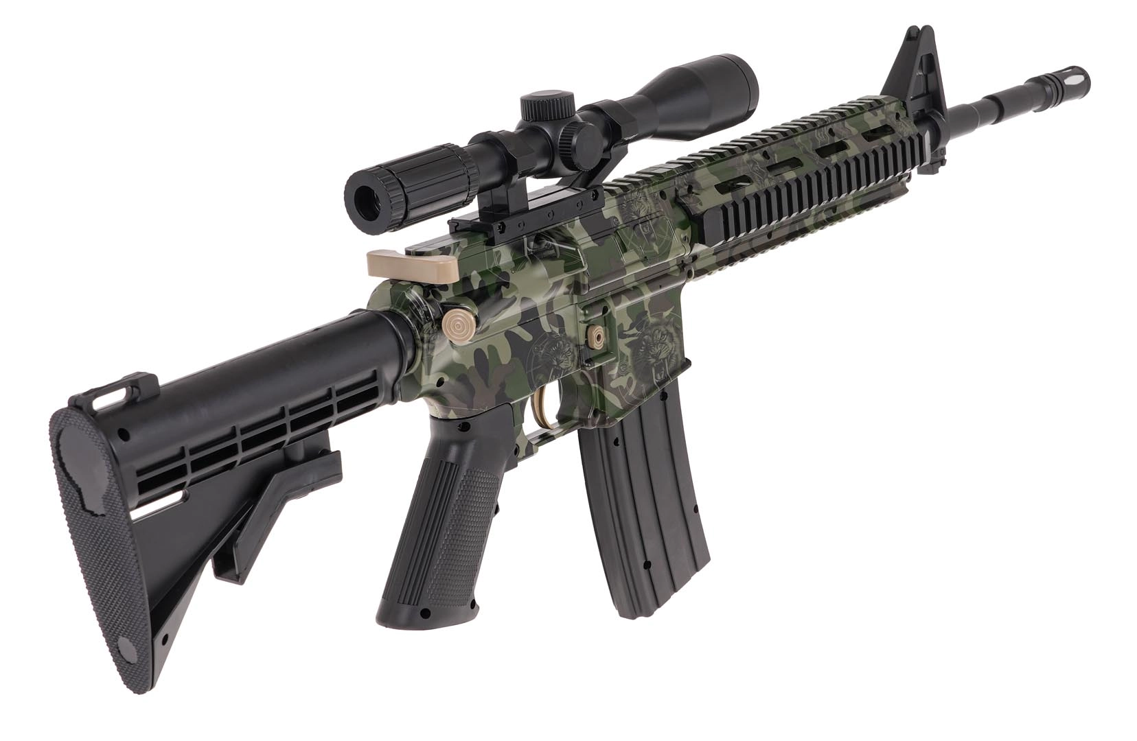 Didelis, taktinis M4 gelinių rutuliukų karabinas idealiai tinka žaidimams lauke ir taiklumo treniruotėms. Dėl dviejų šaudymo režimų mėgausitės ir greitu veiksmu, ir tiksliais pavieniais šūviais. Pridėtą optinį taikiklį su priartinimu galima tiksliai sureguliuoti sukamuoju valdikliu, kad taikinys visada būtų kryžiuose.