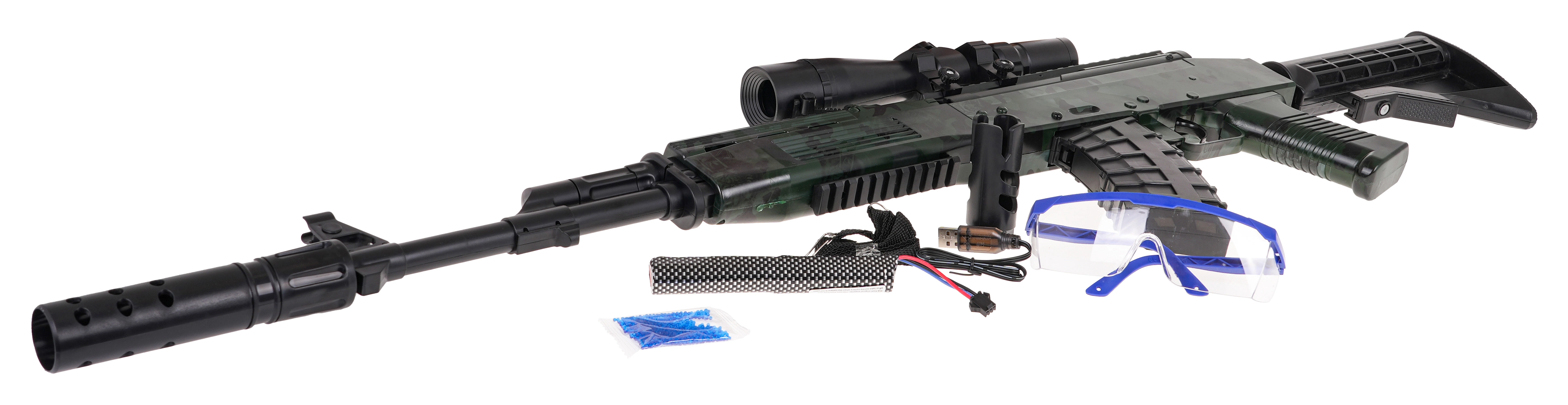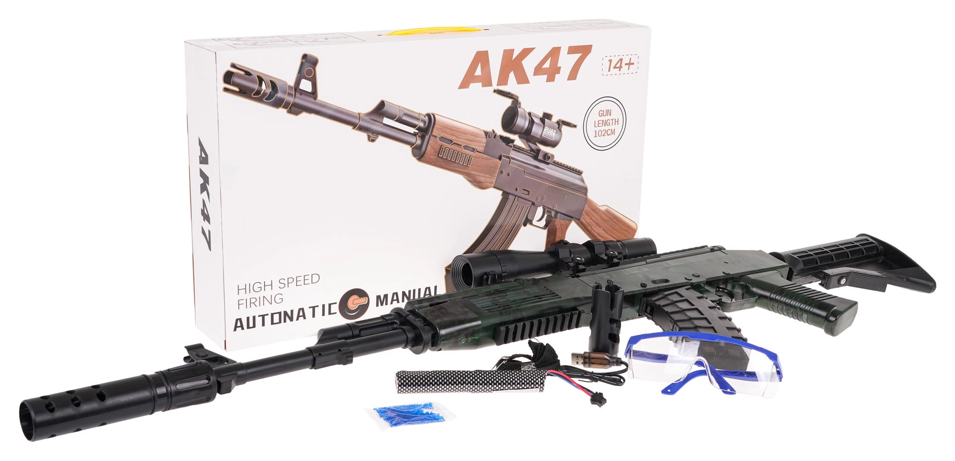 Hidrogeliniai rutuliukai pataikę susprogsta, todėl tinka rekreaciniam naudojimui. Rinkinyje rasite ir apsauginius akinius, 7,4 V akumuliatorių bei USB laidą.