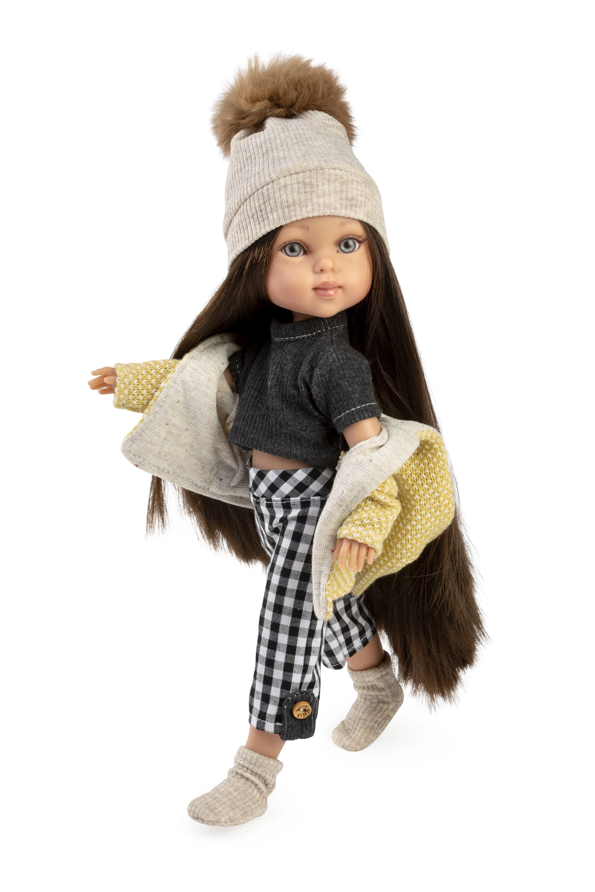 Lėlė Penelope su ilgais plaukais ir stilingais drabužiais suteikia realistišką žaidimo patirtį.