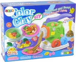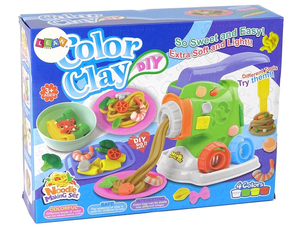 Su šiuo žaismingu rinkiniu vaikai saugiai išbandys „makaronų“ gamybą iš modelino. Pagrindinė dalis – tvirtas presas, kuriuo masė spaudžiama per antgalius, kad įgautų spagečių arba spiralinių makaronų formą. Šonuose rasite mažas formeles brokolio, svogūno ir pupelės formų dar įvairesniam „meniu“.