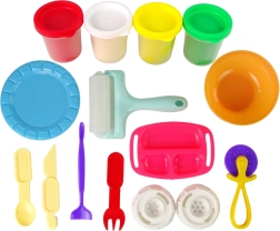 Rinkinyje yra keturi modelino indeliai spalvų: balta, raudona, žalia ir geltona, patogus kočėlas, peiliukas ir mentelė formavimui, dubenėlis ir lėkštutė. Masės konsistencija primena tikrą tešlą, todėl vaikai gali eksperimentuoti nešvaistydami maisto, o tėvai – nesibaimindami netvarkos.