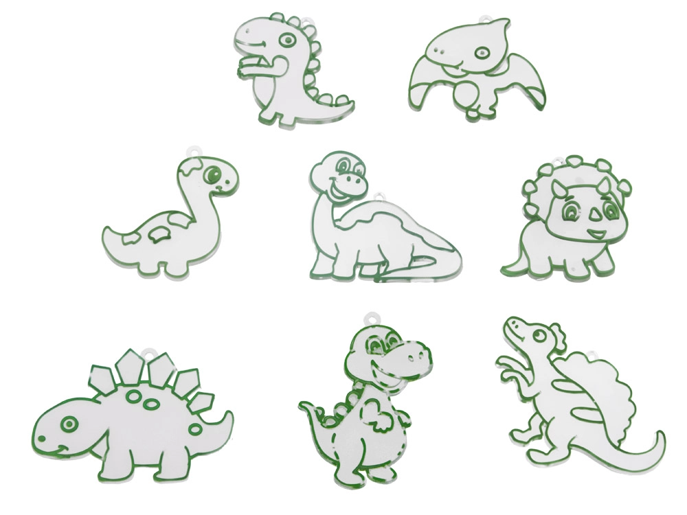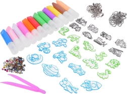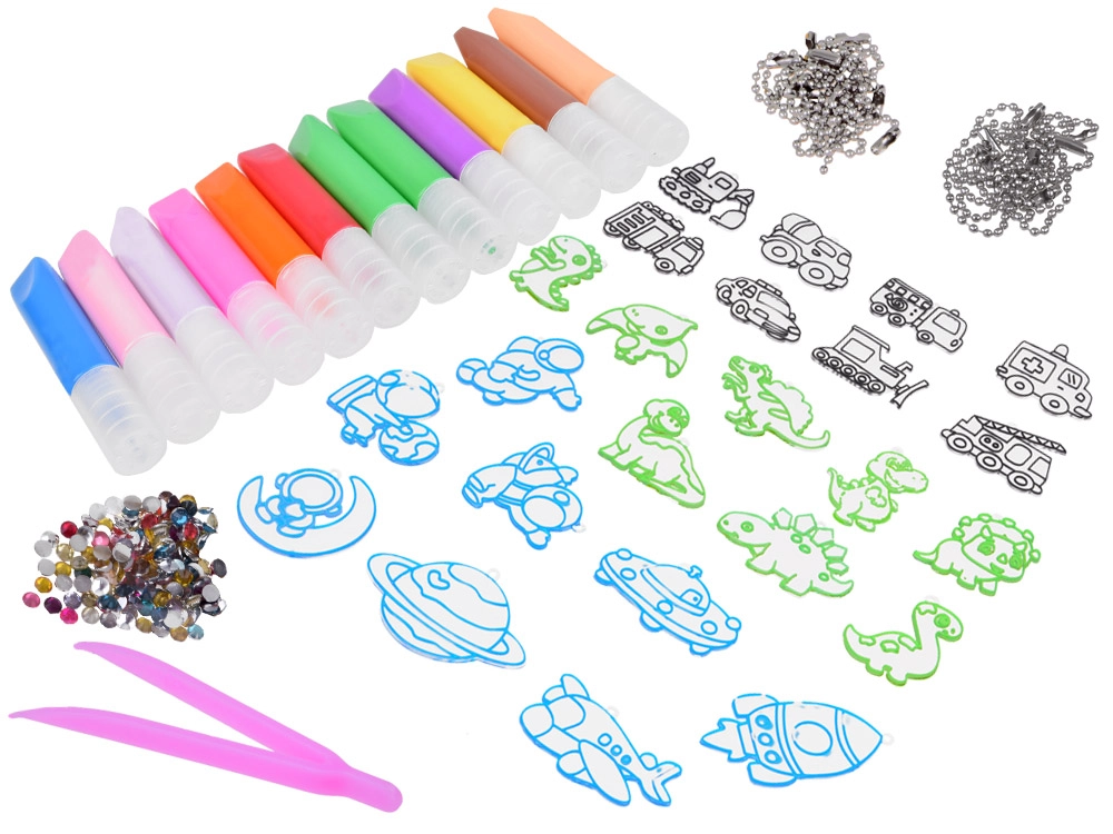 Šis išplėstinis rinkinys suteikia vaikams smagų įvadą į kūrybą. Specialūs dažai lengvai tepami į įgilintas formų linijas, neišbėga už kraštų ir padeda sukurti tikslius, įspūdingus pakabukus. Užbaigtus motyvus tereikia papuošti dekoratyviniais akmenėliais ir pakabinti ant metalinių rutulinių grandinėlių – idealiai tinka raktams, kuprinei ar kaip kambario dekoracija.