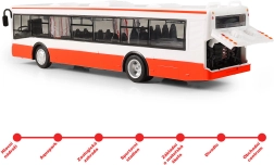 Šis detaliai pagamintas plastikinis 28 cm ilgio autobusas pagyvins kiekvieną vaiko kelionę. Atidarius duris pasigirsta stotelių pranešimai lietuvių kalba, o uždarymo metu papildomai mirksi priekiniai žibintai. Dėl atbulinės įtempimo pavaros autobusas pats pajuda pirmyn ir suteikia daug dinamiško žaidimo.