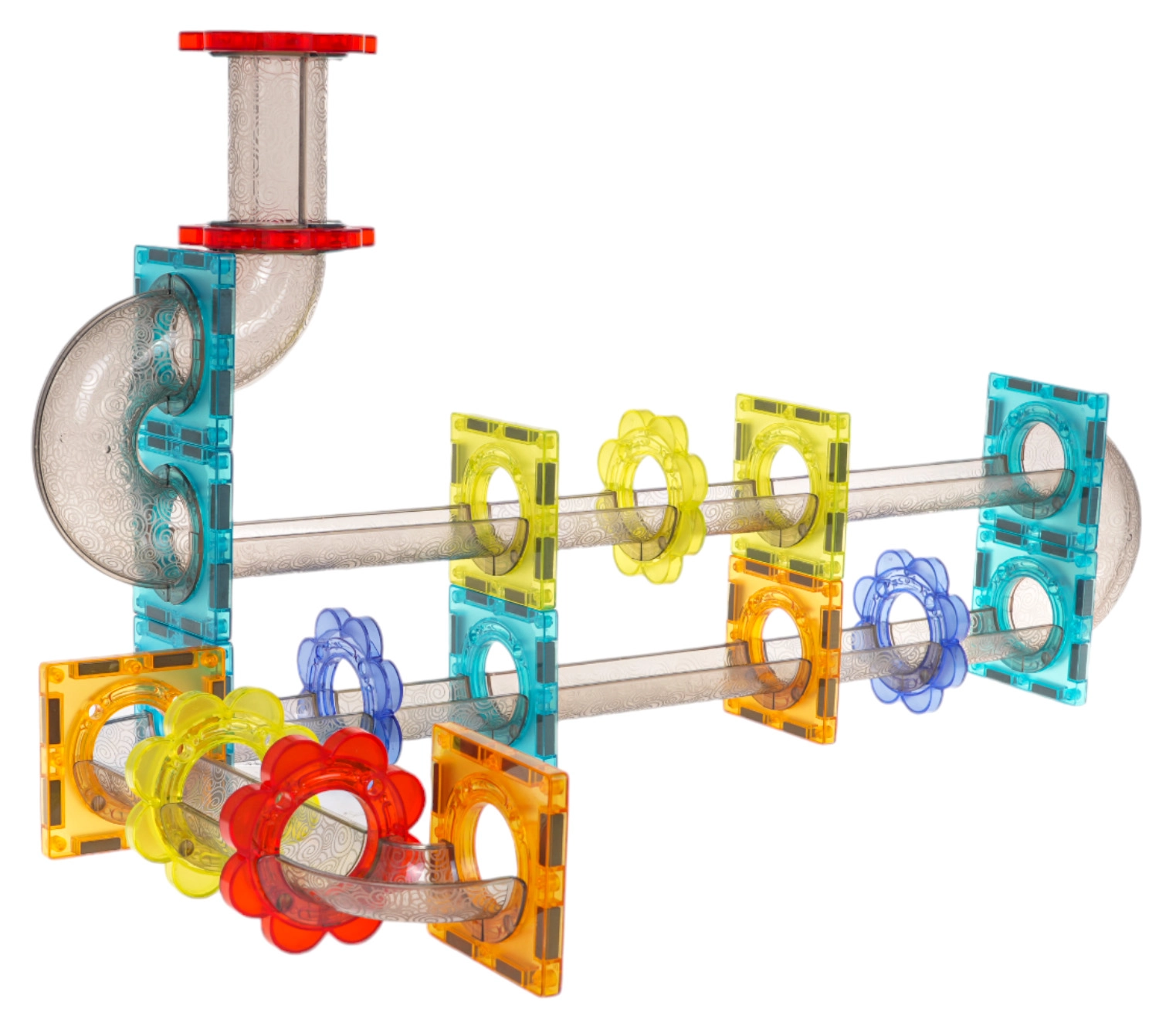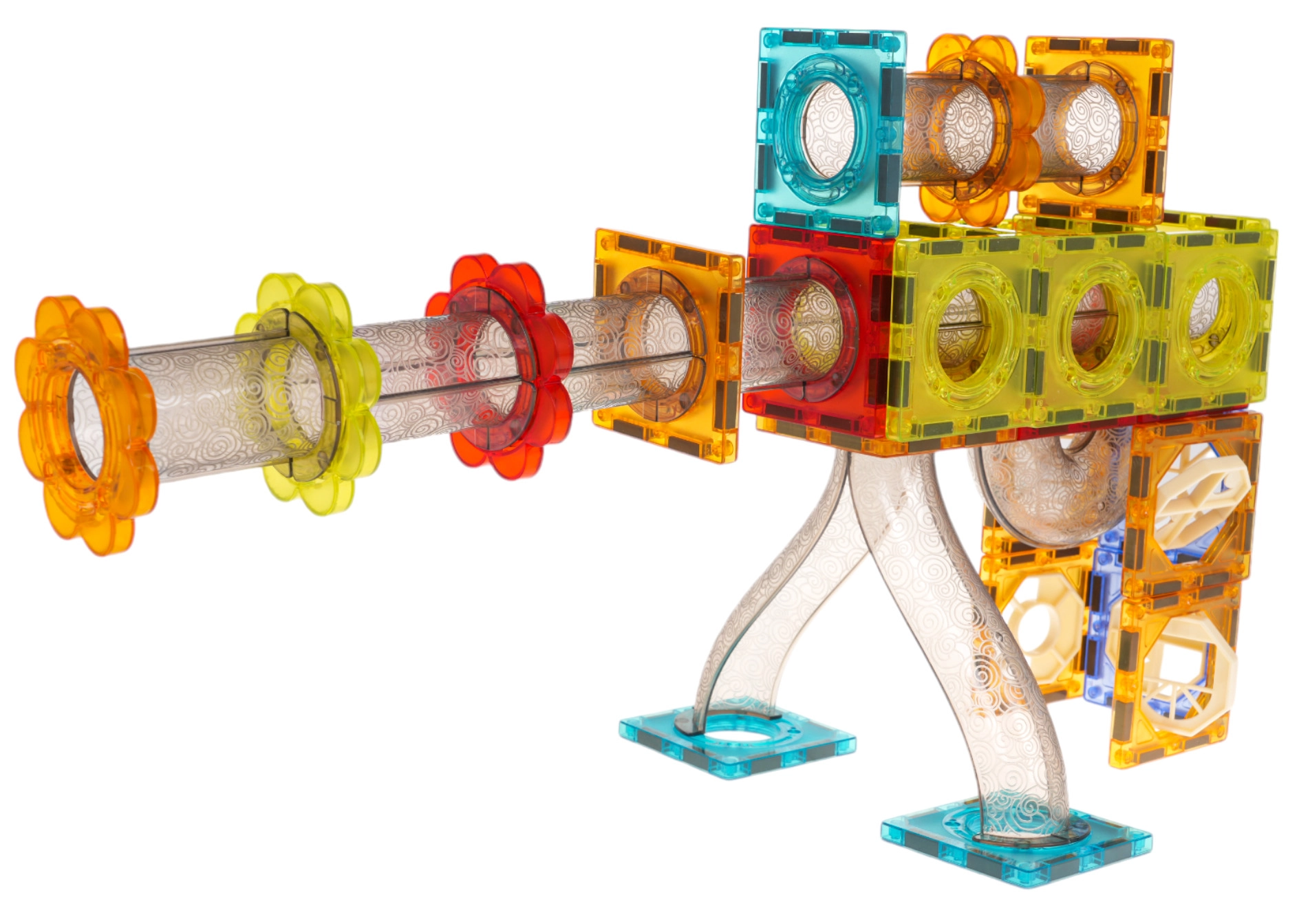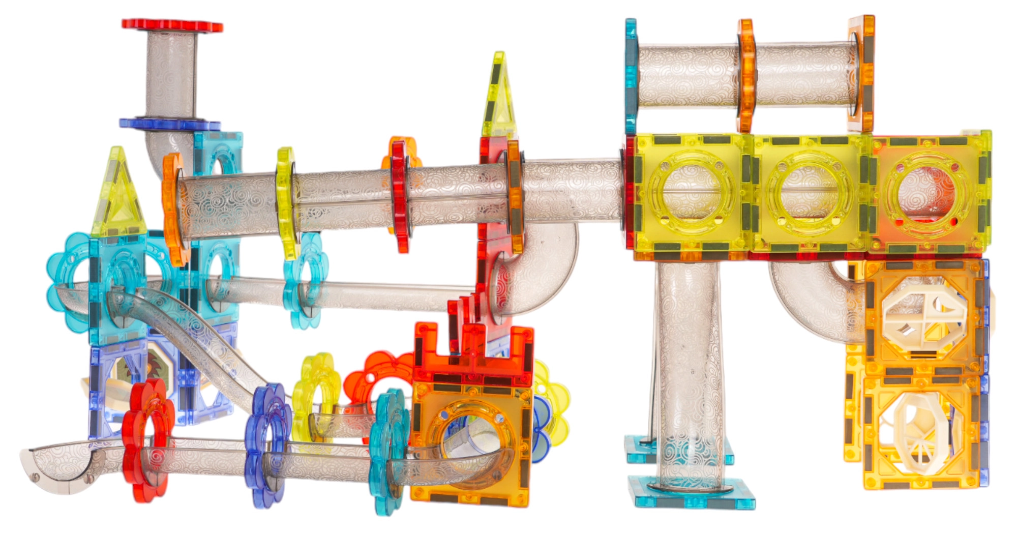 Permatomi elementai tvirtai jungiasi stipriais magnetais. Konstrukcijos išlaiko formą net statant aukštas bokštus ir leidžiantis dinamiškomis rutuliukų trasomis.