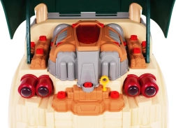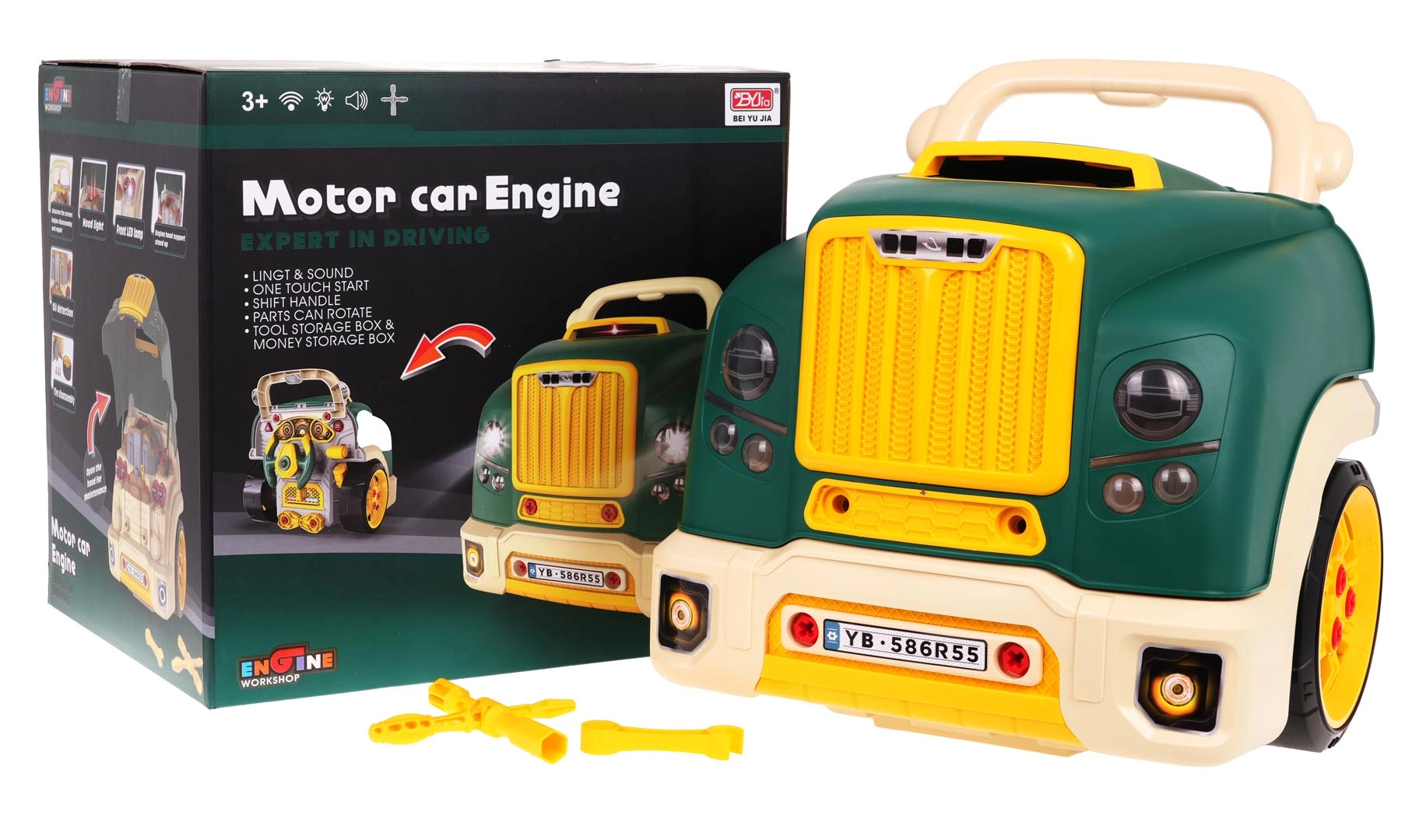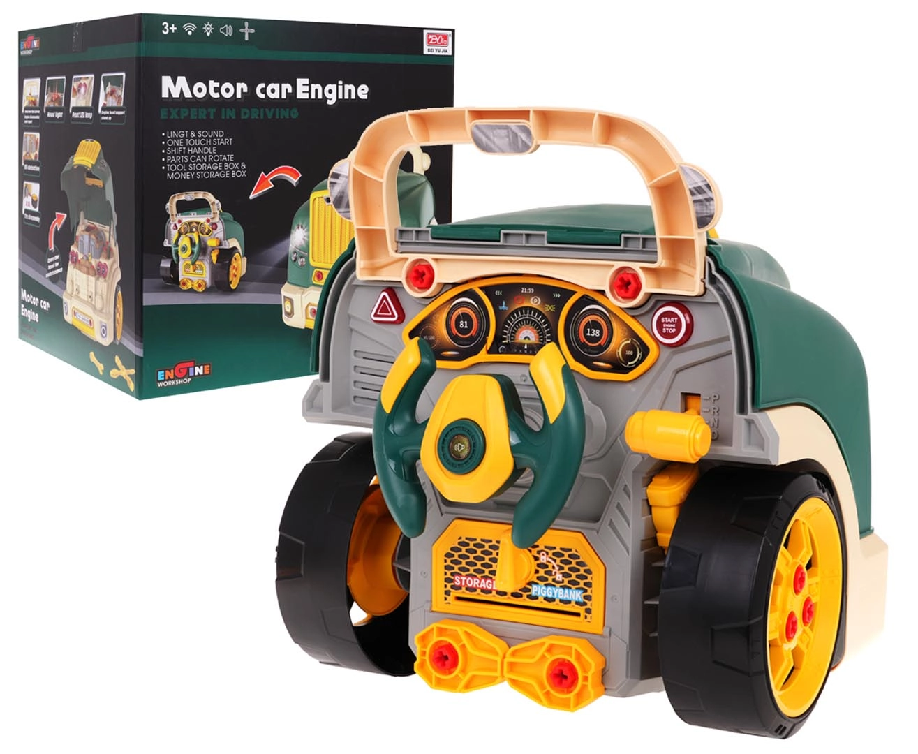 Ši žalia sunkvežimio priekinė dalis su atverčiamu kapotu siūlo daug interaktyvios pramogos: išardomas variklis, šviečiantys žibintai ir autentiški užvedimo, važiavimo bei važiavimo atbulomis garsai. Prietaisų skydelyje rasite užvedimo mygtuką, vairaratį su signalu, įspėjamąjį signalą ir pavarų svirtį. Po vairaračiu yra praktiškas skyrelis įrankiams ir varžtams, taip pat patogi rankena lengvam nešiojimui.