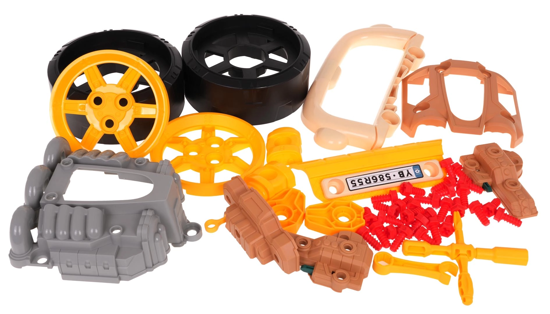 - Automobilio priekinė dalis su išardomu varikliu, ratai su gaubtais, 31 varžtas, įrankiai, dekoratyviniai lipdukai, instrukcija