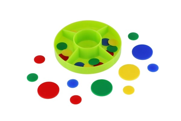 Žaidimas padeda vaikams lavinti smulkiąją motoriką manipuliuojant mažais diskais.