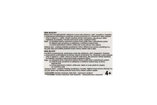 Vaikiškas žaidimas Blusos – tai smagus žaidimas, lavinantis vaikų smulkiąją motoriką ir susikaupimą. Rinkinyje rasite keturis skirtingų spalvų diskelių komplektus, kiekviename – penki maži ir vienas didelis diskas. Taip pat yra dėžutė su sunumeruotais skyreliais, suteikianti daug žaidimo kombinacijų. Užduotis – naudojant didelę blusą įmesti visas mažas blusas į dėžutės skyrelius.