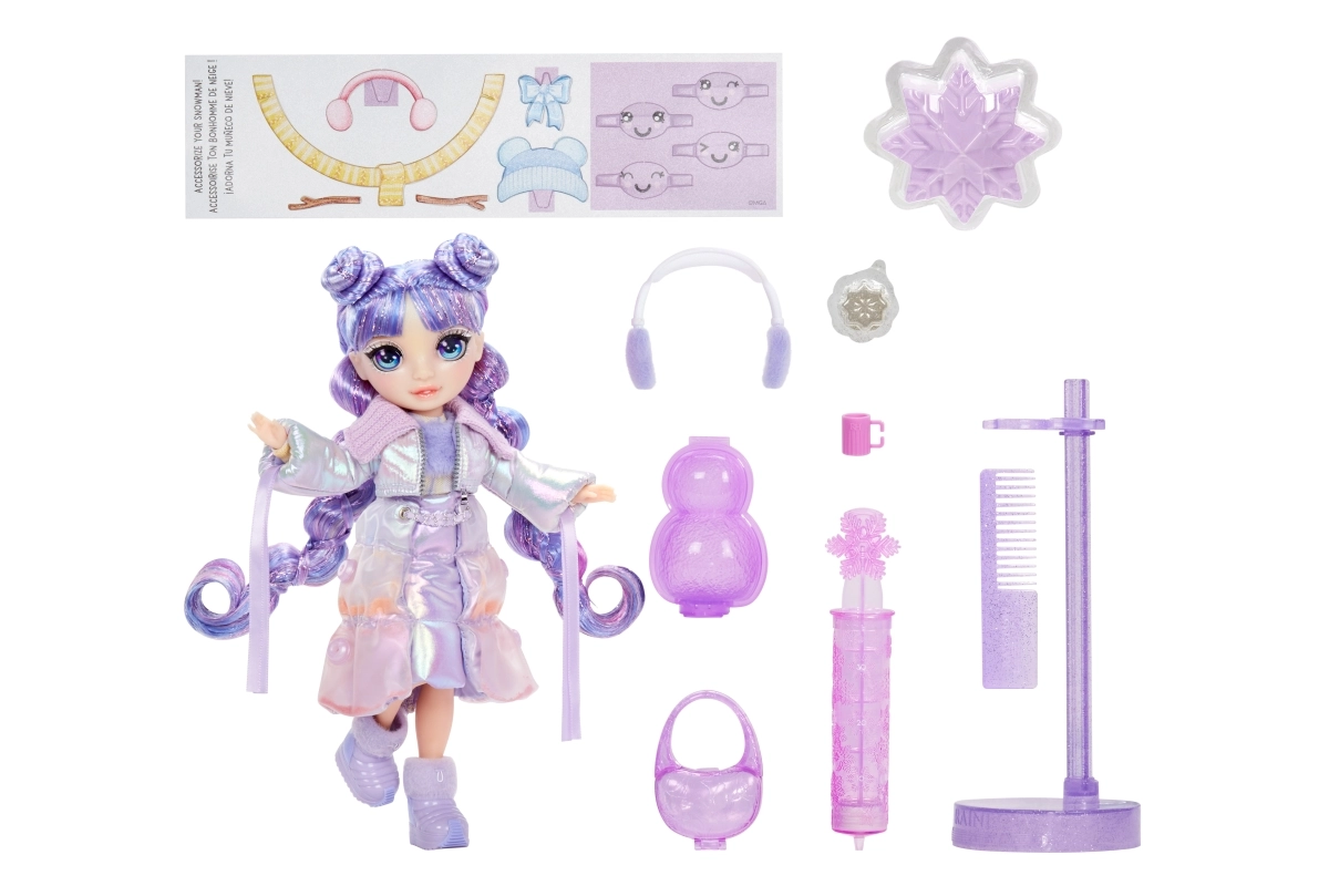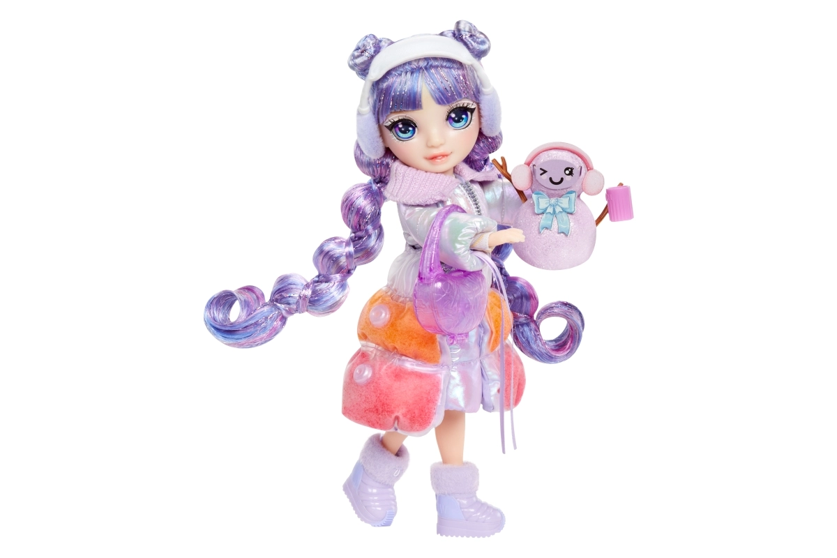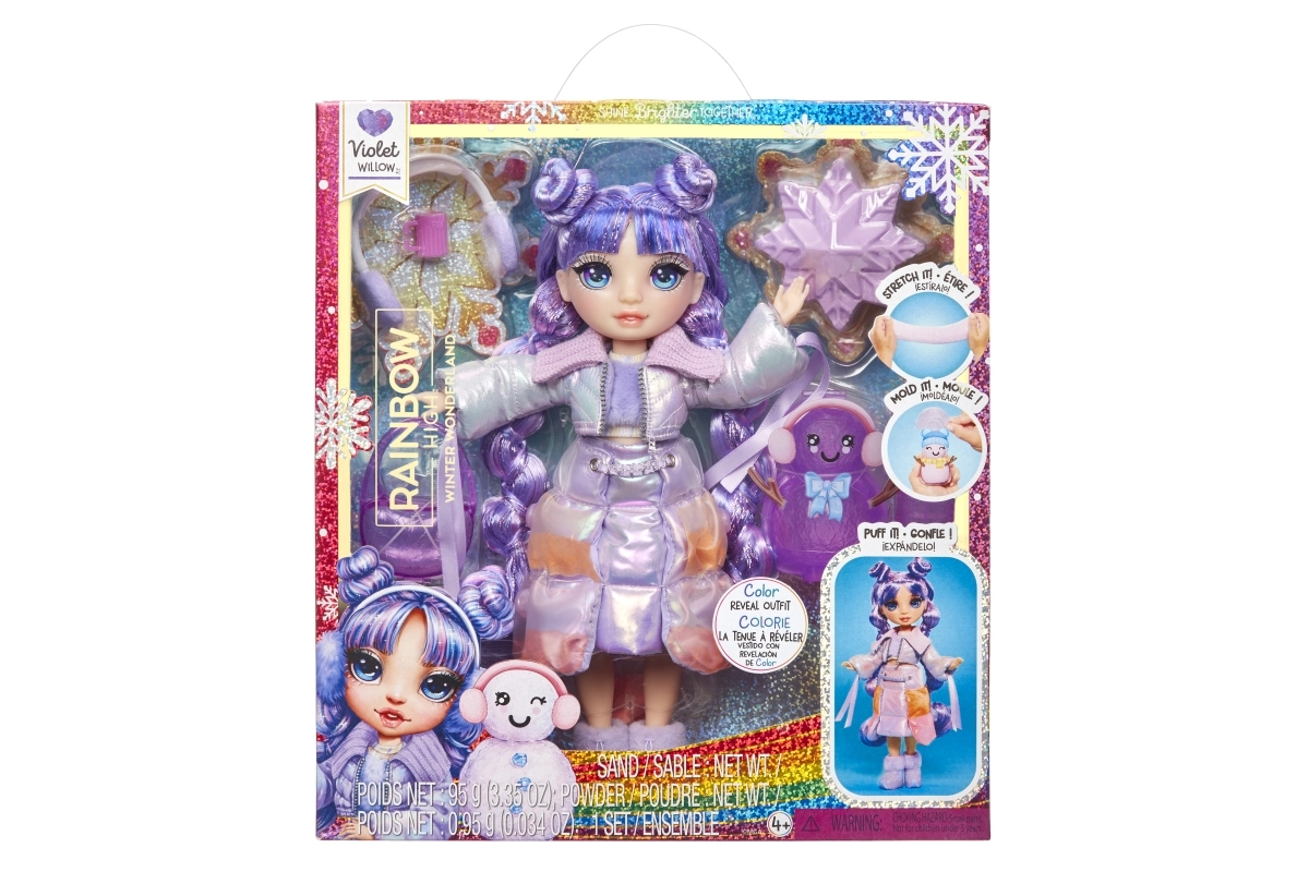 Linksmas žiemos leidimas RAINBOW HIGH pristato violetinę gražuolę Violet Willow, kuri dėl stebuklingo sniego patiria akimirksninę aprangos transformaciją. Pakuotėje rasi daug priedų, stovą ir šepetį, taip pat rinkinį sniego senio kūrimui. Visiškai judri 28 cm lėlė begaliniams mados ir žiemos žaidimams.