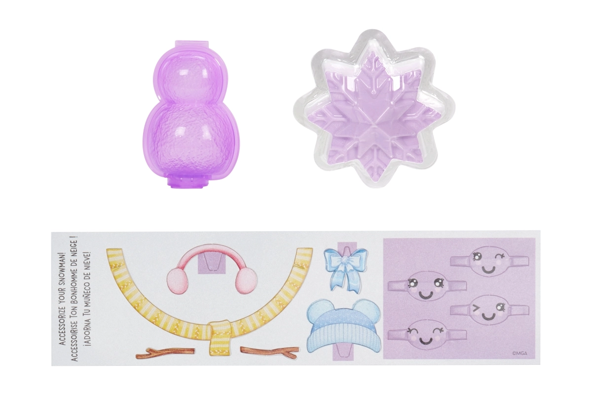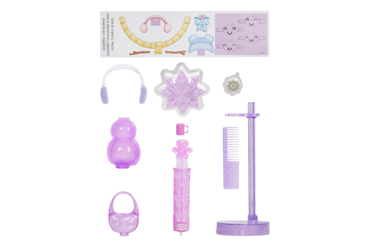 Pakuotėje taip pat rasi žiemos aksesuarus stiliui ir fotografavimui, patogų stovą eksponavimui, plaukų šepetį ir kūrybinį rinkinį savo sniego seniui sukurti iš formuojamo „sniego“. Visiškai judri lėlė lengvai pozuoja ir savo violetiniu įvaizdžiu papuoš bet kurią kolekciją.