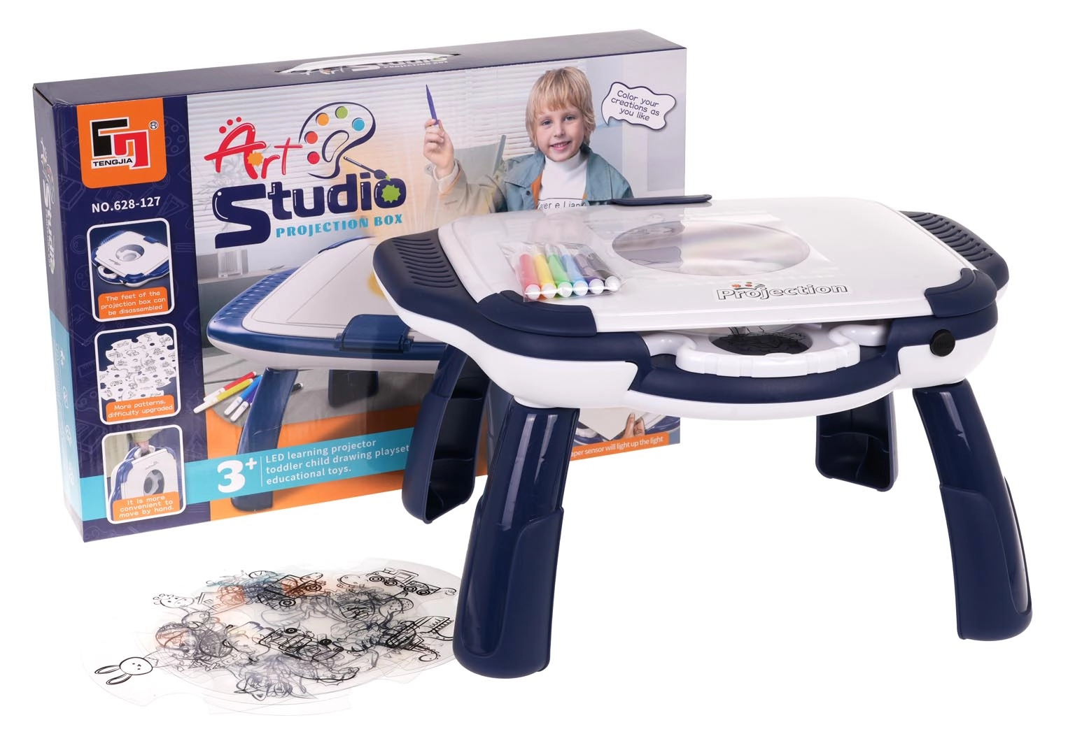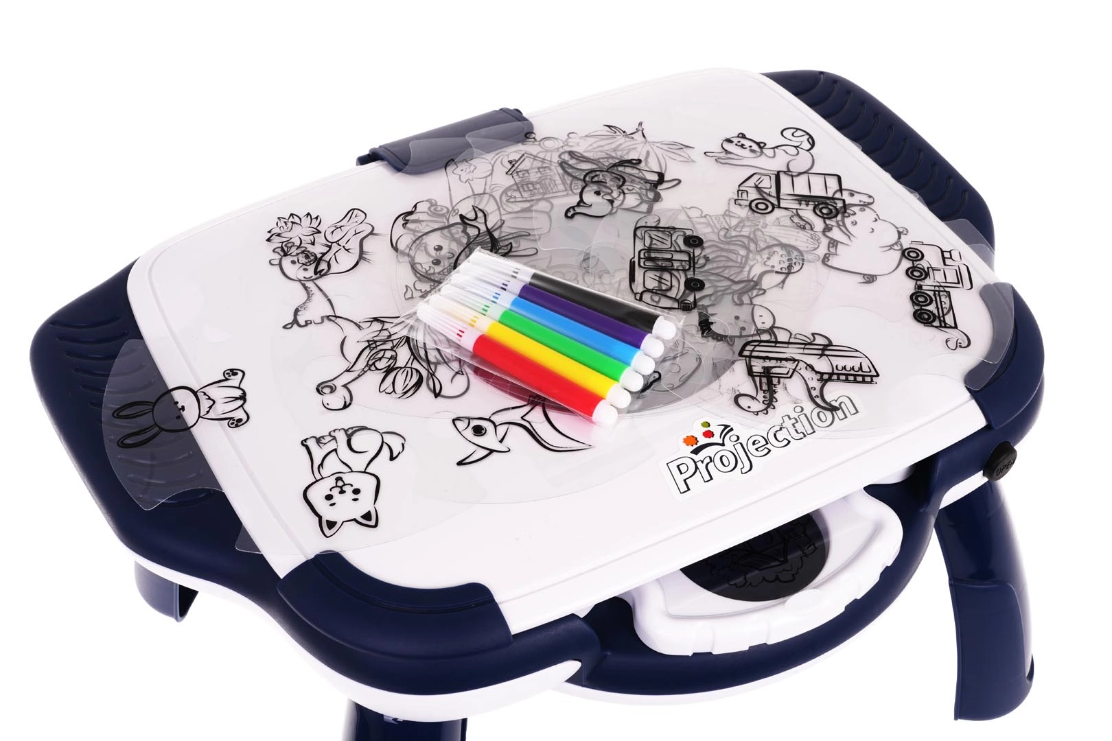 Projektuojantis piešimo staliukas – puikus būdas palengvinti vaikams pirmuosius žingsnius kūrybos pasaulyje. Dėl 12 diskų su 4 skaidrėmis kiekviename galima rinktis iš dešimčių vaizdų – nuo gyvūnų ir dinozaurų iki transporto priemonių, namų ir augalų. Vaizdas projektuojamas tiesiai ant piešimo paviršiaus, o vaikas gali jį paprastai apibrėžti.