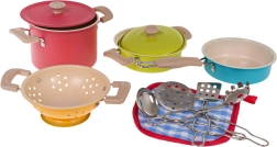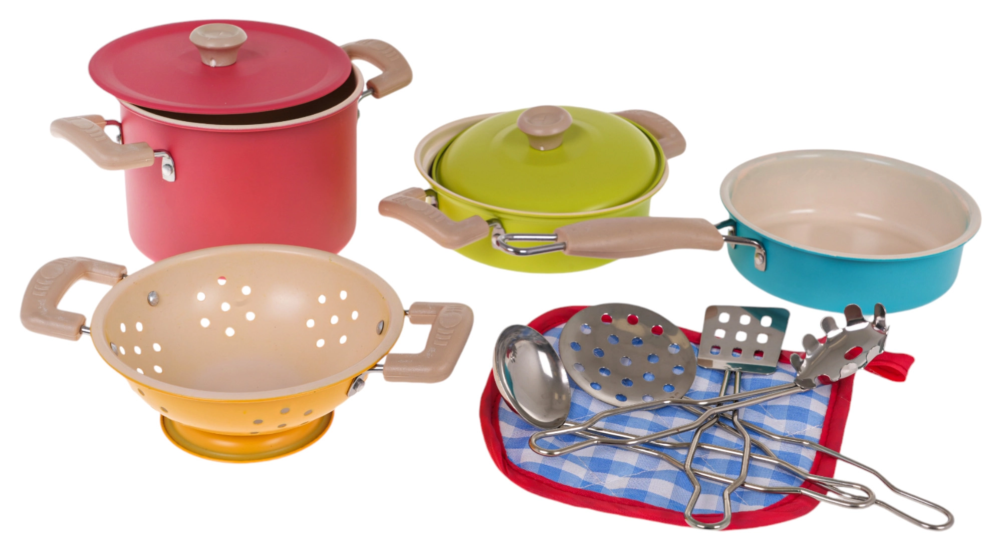 Šis spalvingas vaikų indų rinkinys atneša autentišką gaminimo patirtį į kiekvieną vaikų virtuvėlę. Du puodai su dangteliais, keptuvė, sietuvas ir keturi praktiški virtuvės įrankiai suteikia viską, ko vaikams reikia mėgdžioti tikrą gaminimą. Dėl metalo medžiagų rinkinys yra tvirtas, patvarus ir paruoštas kasdieniam žaidimui.