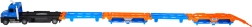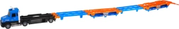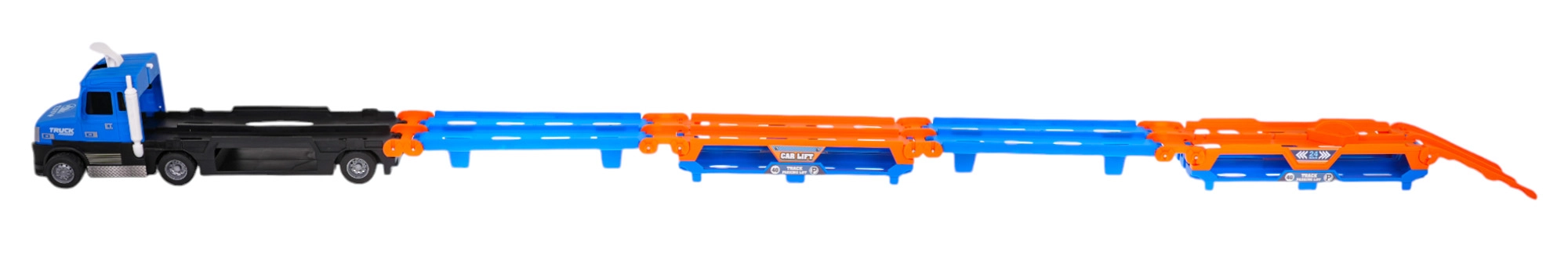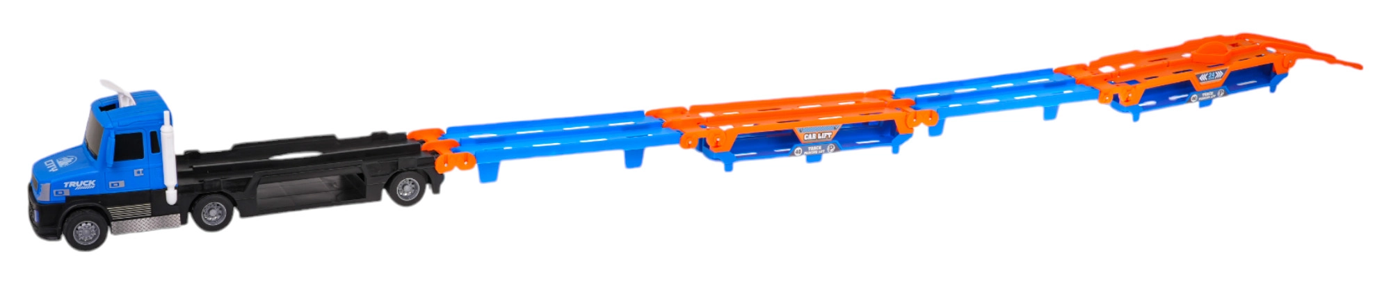 Išskleidus sunkvežimis sukuria dviejų lygių trasą iki 140 cm ilgio – idealiai tinka lenktynėms su pridėtais automobiliukais.
