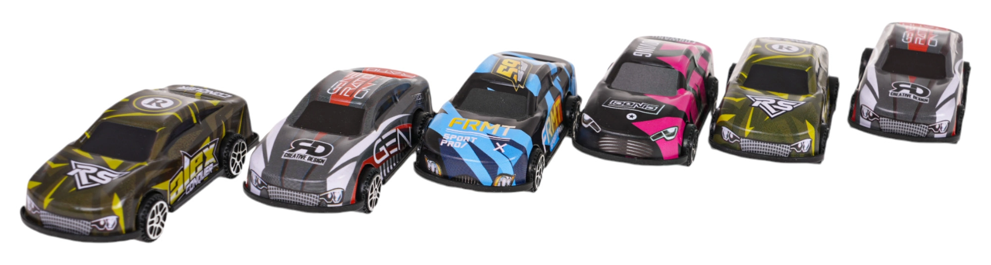 Rinkinyje yra šeši detalūs automobiliai su metaliniais kėbulais ir aerodinamine konstrukcija – paruošti lenktynėms.