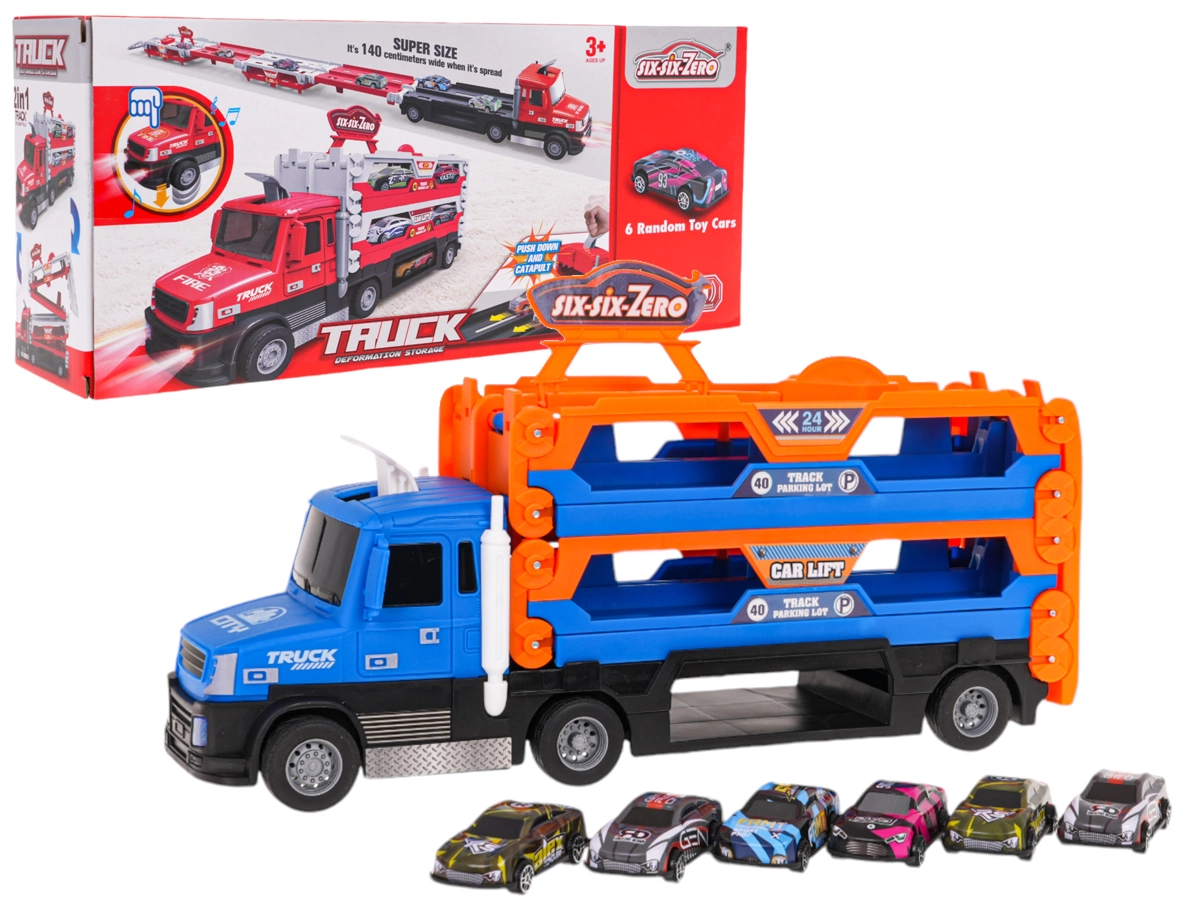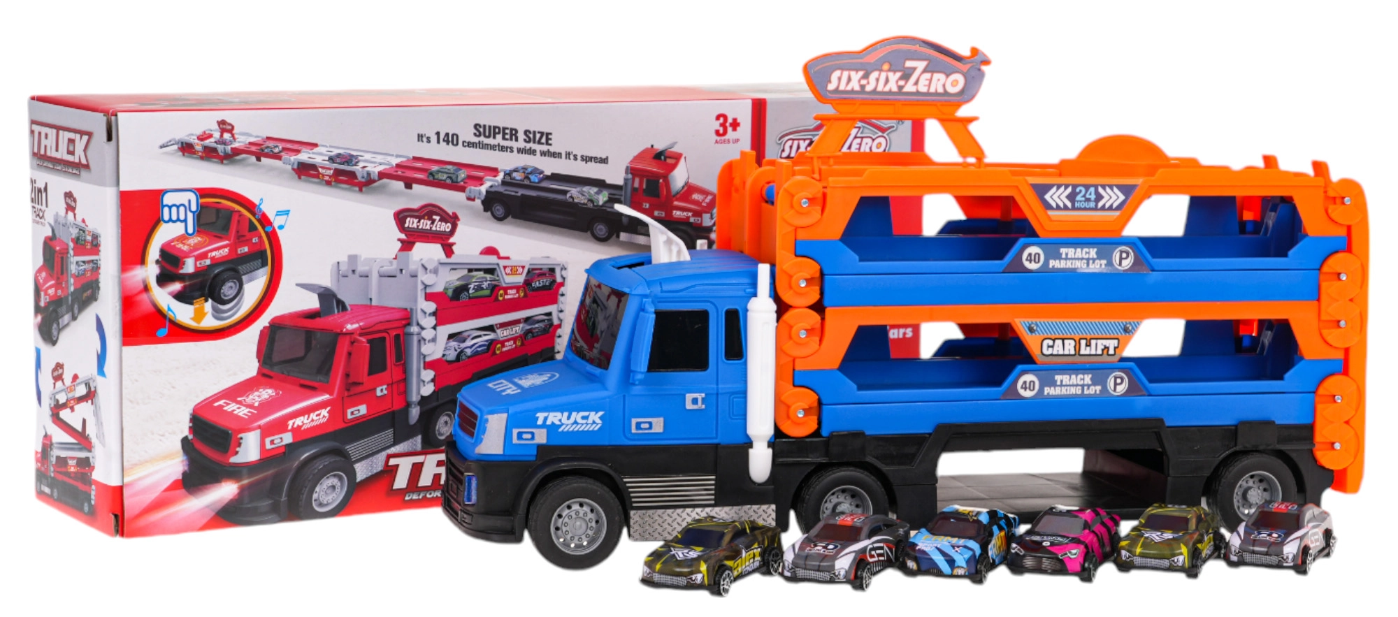 Interaktyvus trijų lygių sunkvežimis su katapultu vaikams nuo 3 metų siūlo ir saugojimą, ir lenktynes viename. Išskleidus jis virsta iki 140 cm ilgio lenktynių trasa, o dėl guminių padangų yra stabilus važiuojant. Komplekte yra 6 metaliniai automobiliai (1:64), šviesos ir garso efektai bei šaudyklė dinamiškam žaidimui.
