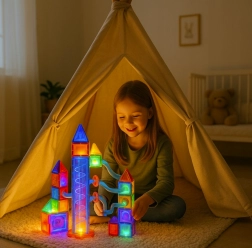 Atraskite kūrybinį rinkinį vaikams nuo 3 metų – magnetiniai kaladėlės ir skaidrios vamzdeliai kuliukų trasoms su šviesos efektais kurti. Rinkinį sudaro 134 dalys, jame yra LED elementai, žvaigždžių projektorius, prožektoriai ir net varomas kuliukų keltuvas. Lavina smulkiąją motoriką, erdvinį mąstymą ir kūrybiškumą – pramoga ir mokymasis viename.
