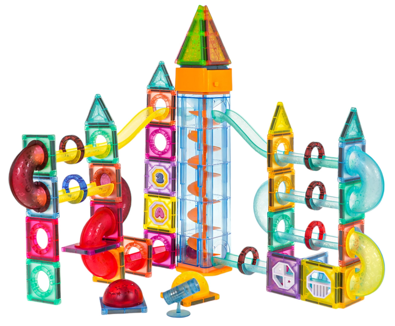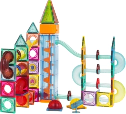 Skaidrūs vamzdeliai, magnetinės formos ir unikalūs elementai leidžia vaikams kurti originalias trasas, skatinančias vaizduotę ir loginį mąstymą.