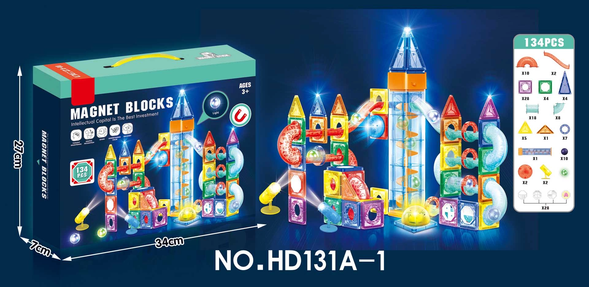 - 32 × magnetiniai kvadratai, 10 × magnetiniai trikampiai (įvairių dydžių), skaidrūs vamzdeliai, kiti konstrukciniai elementai, 4 × šviečiantis kuliukas, 10 × kuliukas, 2 × šviečiantis diskas, 2 × prožektorius, lipdukai, instrukcija