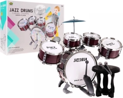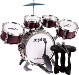 Sudėtyje yra visi reikalingi elementai: penki būgnai, lėkštė, lazdelės ir kėdutė.