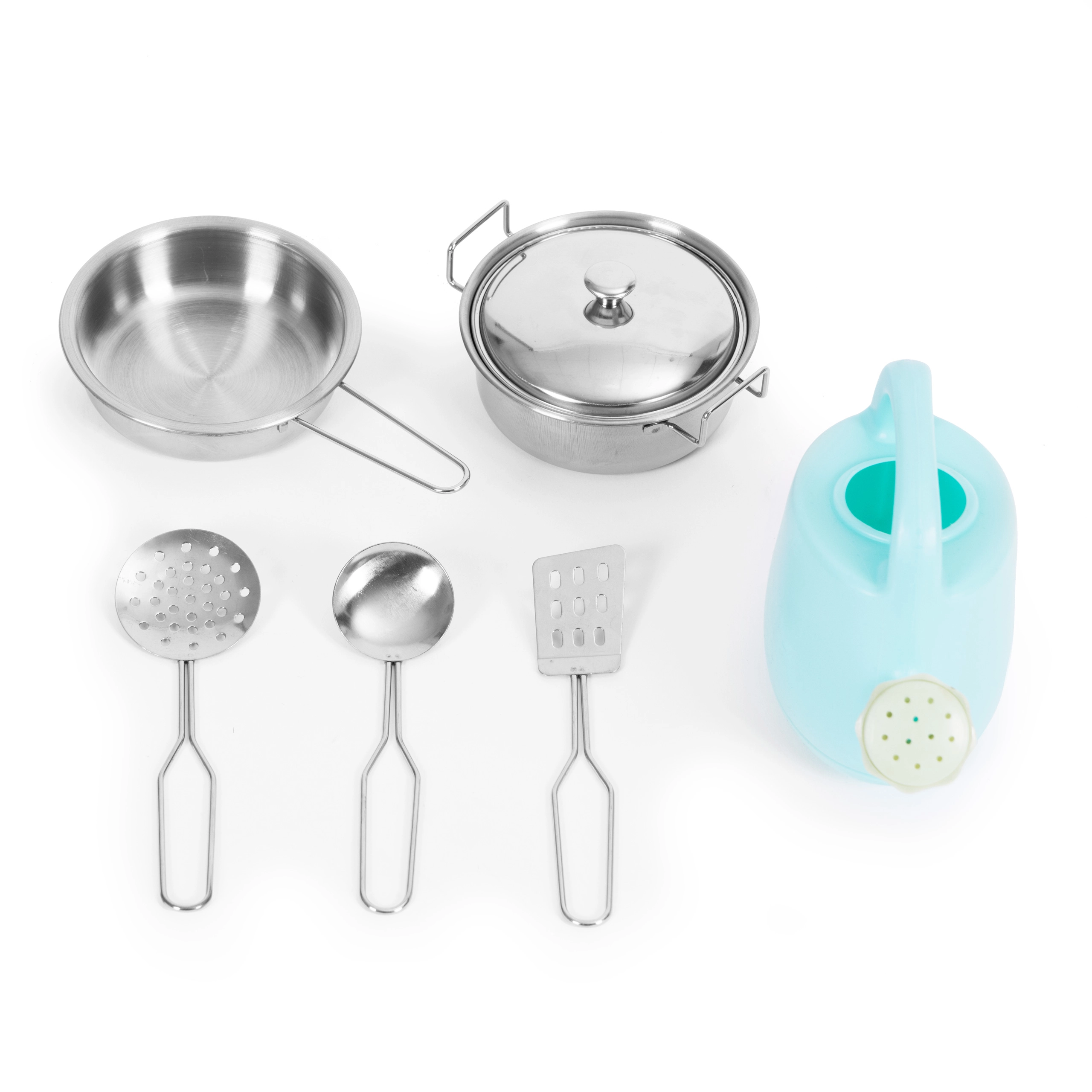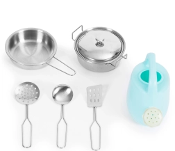 Rinkinyje yra puodas su dangčiu, keptuvė, dvi mentelės, samtis ir arbatinukas – viskas paruošta mažiems kulinariniams eksperimentams.