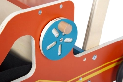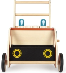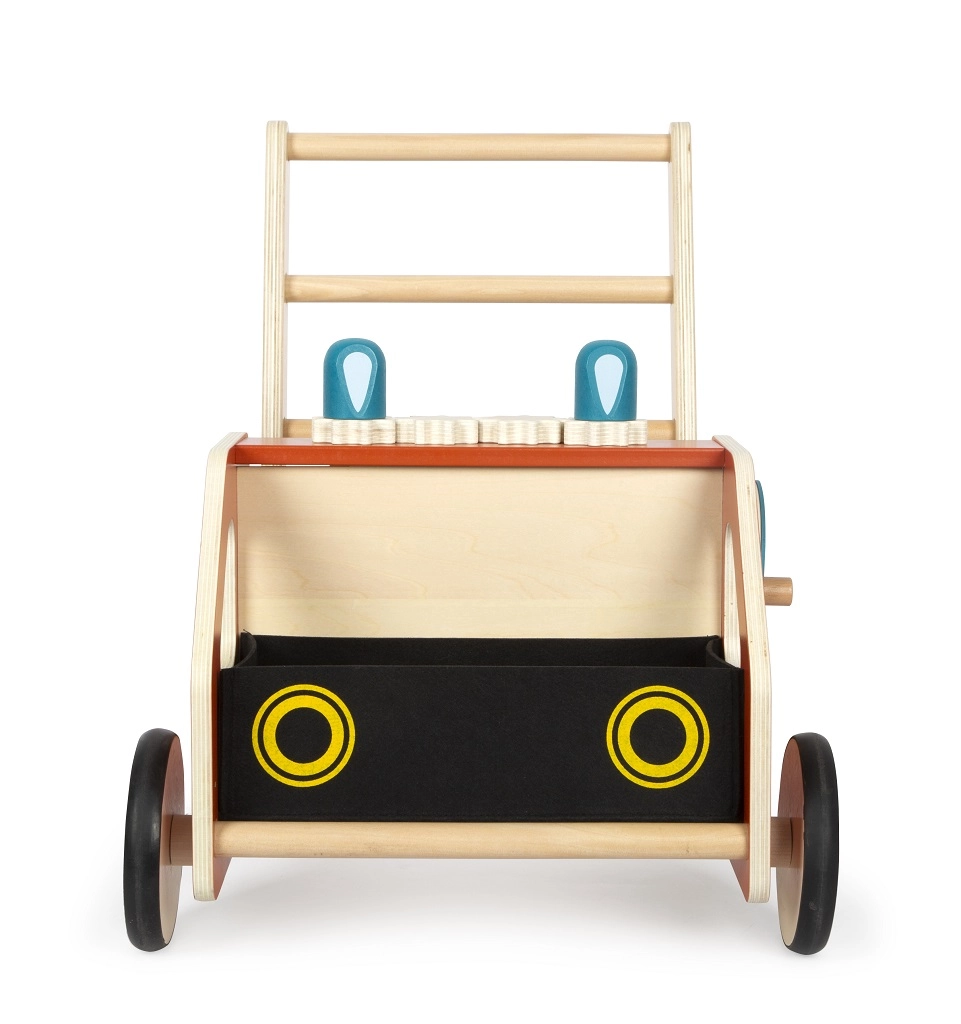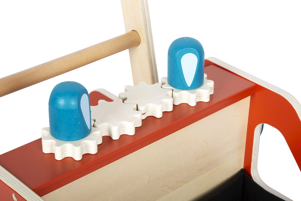Už pramogą ir smulkiosios motorikos lavinimą atsako funkcionalios detalės: dantračiai, sukamasis vairas su rankenėle ir judančios mėlynos šviesos. Išimamas veltinio krepšys tinka kaip laikymo vieta žaislams ir smulkmenoms, kad kiekviena „išvyka“ būtų greita ir tvarkinga.
