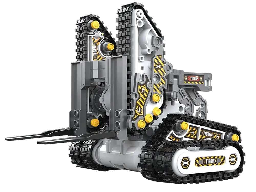 Iš vieno rinkinio surinksite tanką, medkirtį, šakinį krautuvą ir vikšrinį ekskavatorių – kiekvienas modelis turi judančių dalių ir paruoštas nuotoliniam valdymui.