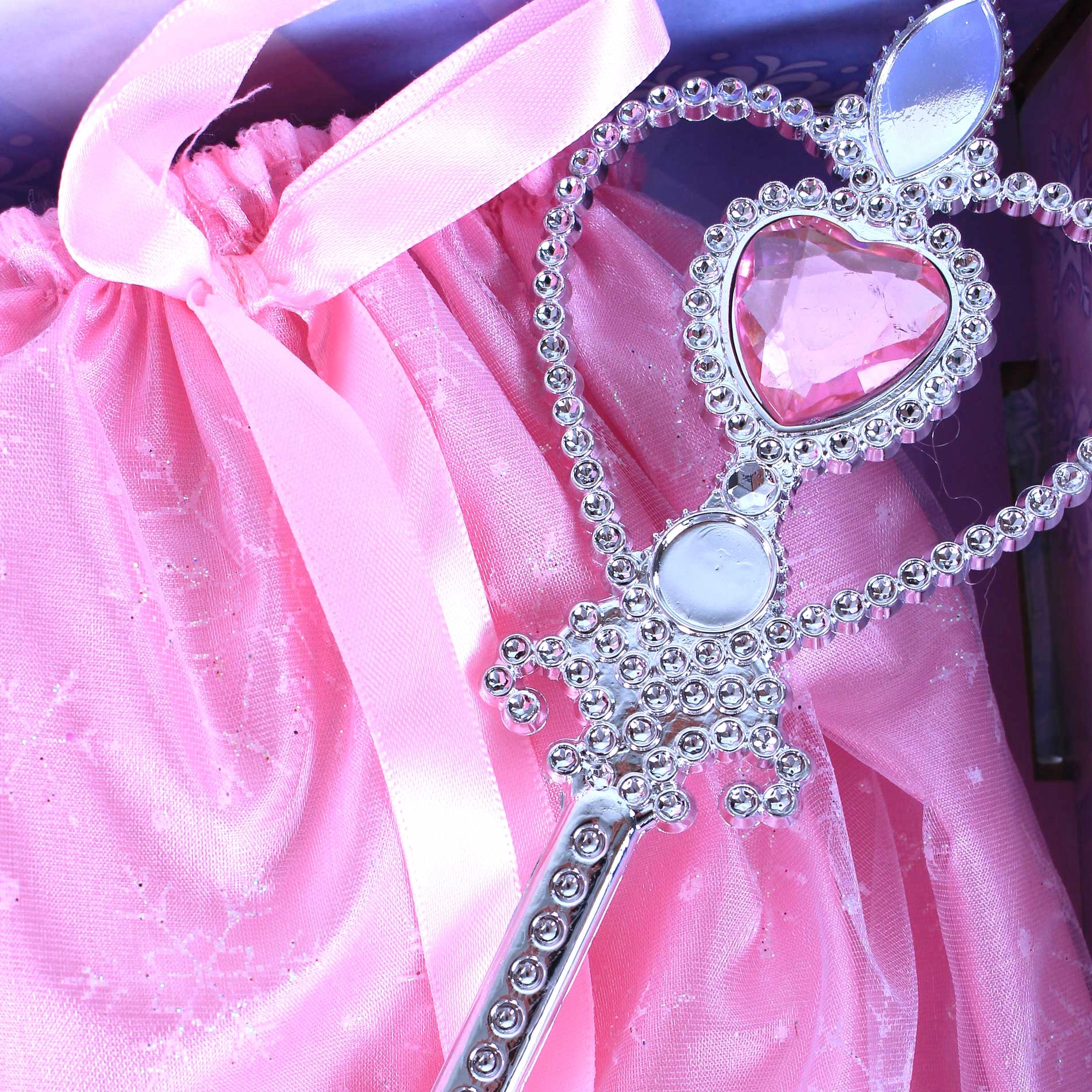 Išskirtinis rožinis rinkinys mažosioms princesėms, kuris tobulai užbaigs kiekvieną persirengimą. Sudėtyje: sijonėlis, bateliai, karūna, skeptras, auskarai, žiedas, vėrinys ir rankinė – viskas gražiai suderinta ir papuošta rožiniais akmenėliais maksimaliai išvaizdai. Idealu karnavalui, šventėms ir žaidimams namuose. Papildyk savo kostiumą nuostabiais aksesuarais vieningo stiliaus ir mėgaukis spindinčia princesės išvaizda.