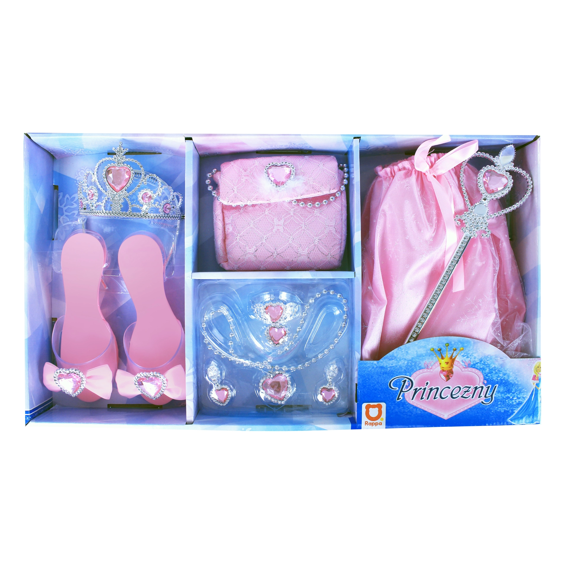Per akimirką tapkite tikra princese. Šis stilingas rožinis komplektas siūlo viską, ko reikia žavingai išvaizdai – nuo karūnos ir skeptrą iki derančių papuošalų ir rankinės. Visi elementai suderinti rožiniais tonais ir puošti blizgančiais akmenėliais, kurie suteikia kiekvienam kostiumui išskirtinio žavesio.