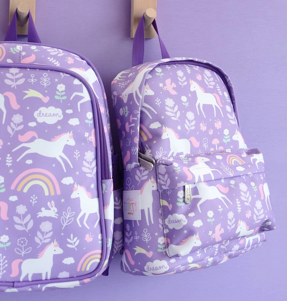 Krūtinės dirželis padeda išlaikyti petnešas ant pečių, todėl kuprinė geriau priglunda net bėgant ir žaidžiant. Spalvinga spauda su vienaragiais ir vaivorykšte paverčia kuprinę stilingu mažųjų nuotykių palydovu.
