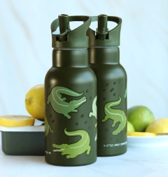 Stilinga vaikų gertuvė iš nerūdijančio plieno, 350 ml talpos, su krokodilo motyvu, derina dvisienę izoliaciją geram temperatūros išlaikymui, patogų snapelį su šiaudeliu šaltiesiems gėrimams ir patvarų dizainą, ideali darželiui, mokyklai ir išvykoms.